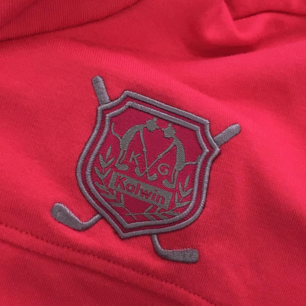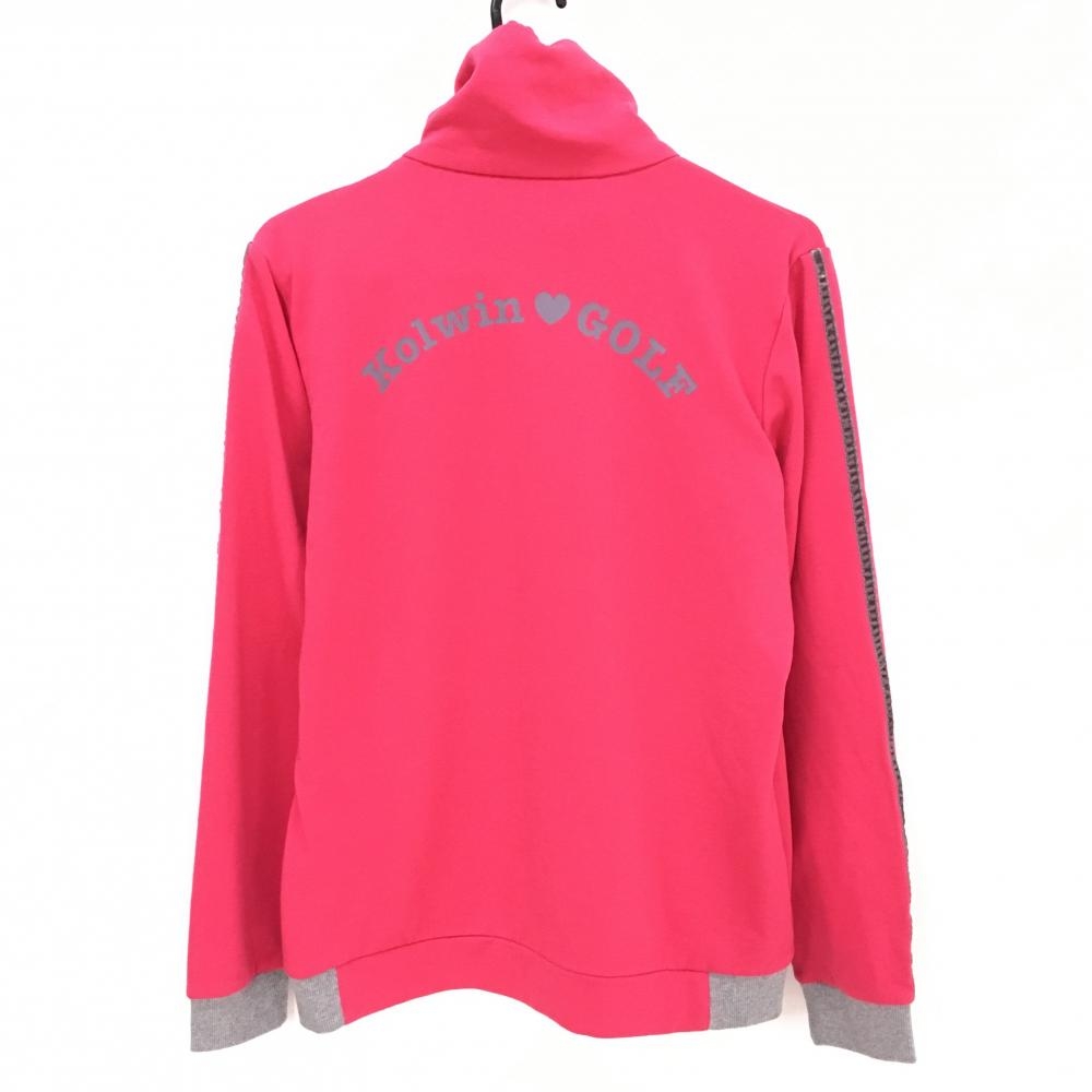 【美品】コルウィン ハイネックジャケット ピンク×グレー 袖ライン ワッペン レディース LL ゴルフウェア Kolwin