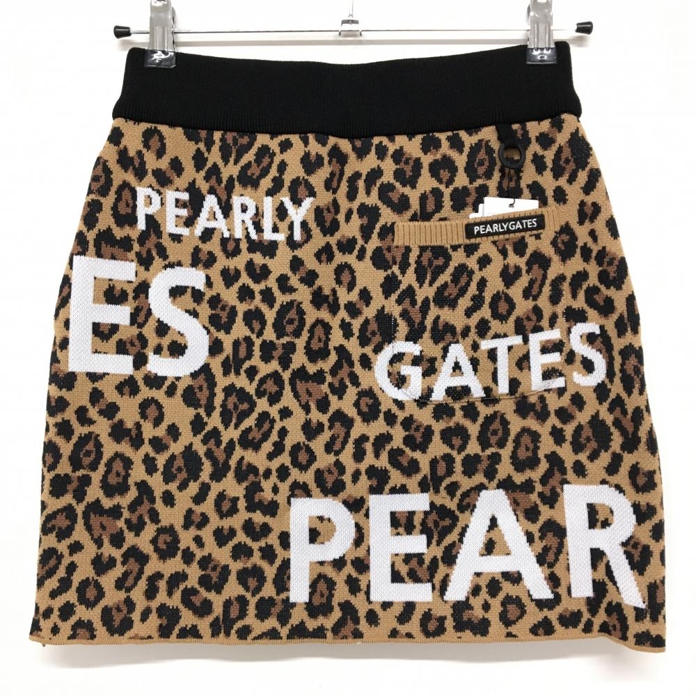 【新品】パーリーゲイツ ニットスカート ライトブラウン×黒 レオパード柄 ロゴ白 ウール混 レディース 0(S) ゴルフウェア PEARLY GATES