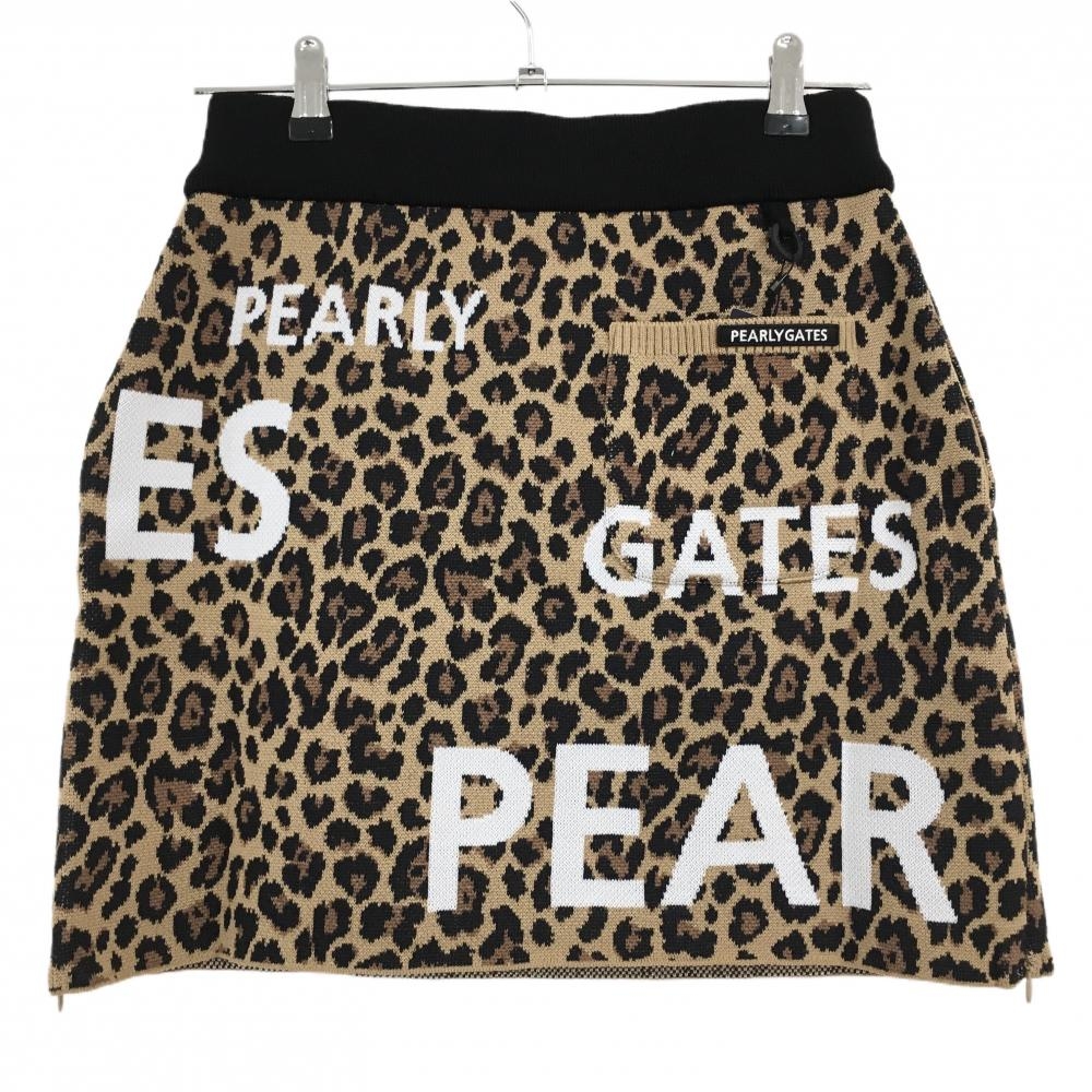 【新品】パーリーゲイツ ニットスカート ライトブラウン×黒 レオパード柄 ロゴ白 ウール混 レディース 1(M) ゴルフウェア PEARLY GATES