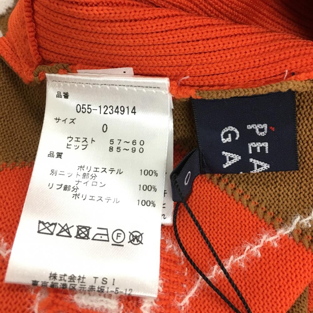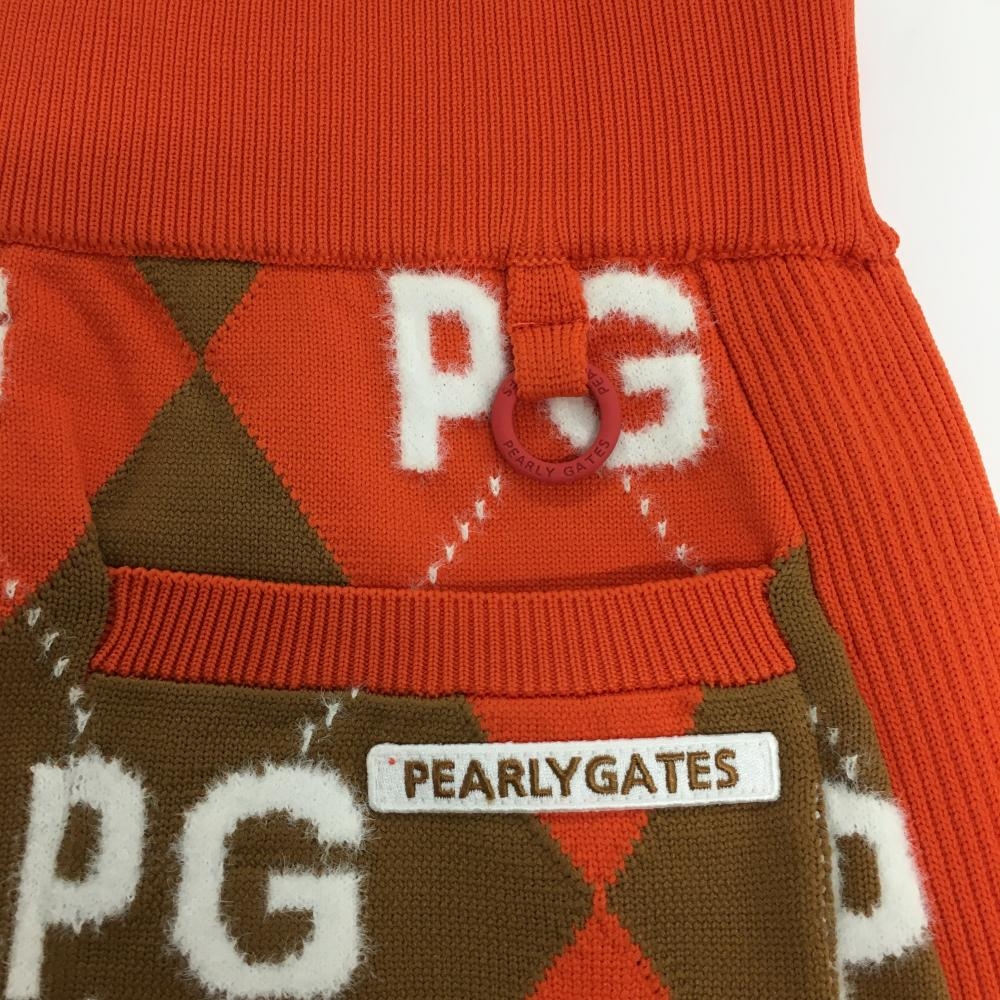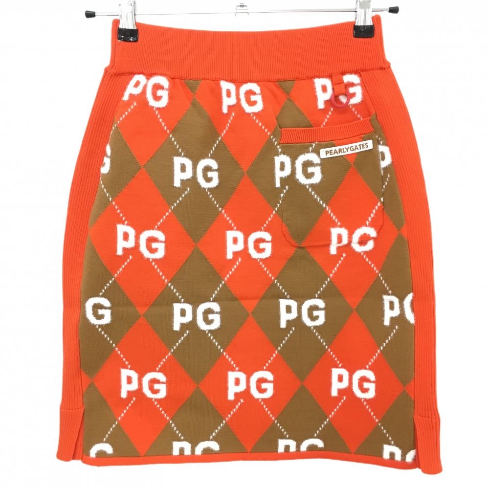 【新品】パーリーゲイツ ニットスカート オレンジ×ブラウン アーガイル柄 ロゴ ウエストゴム レディース 0(S) ゴルフウェア PEARLY GATES