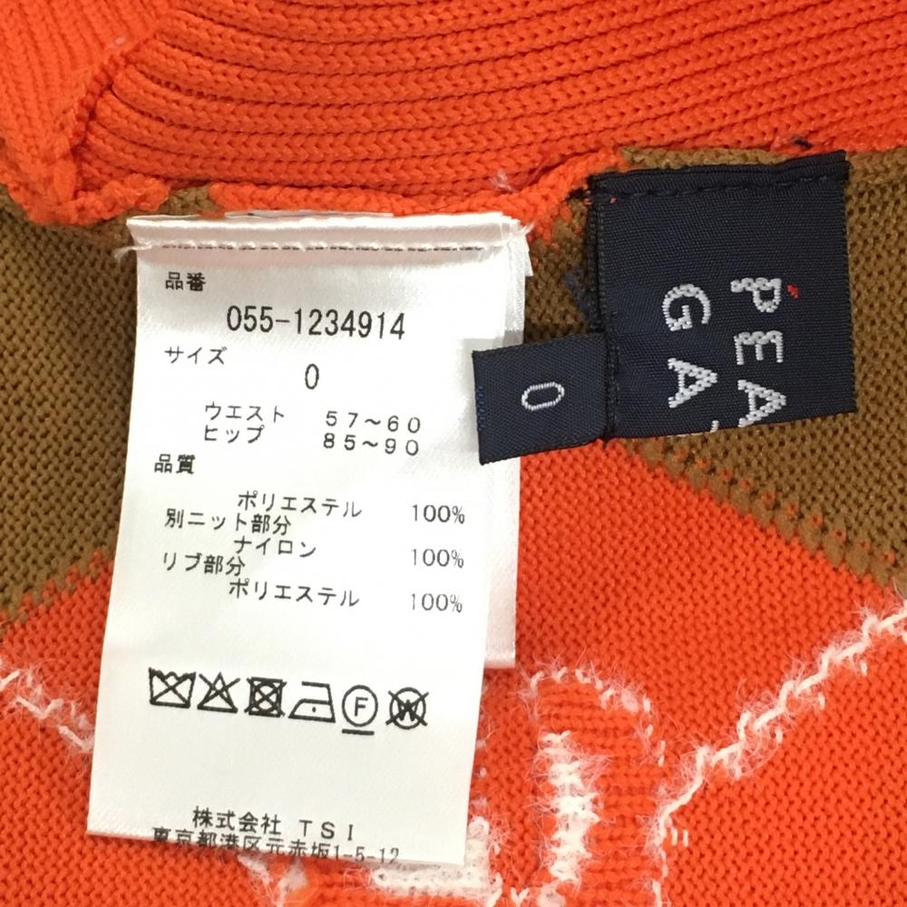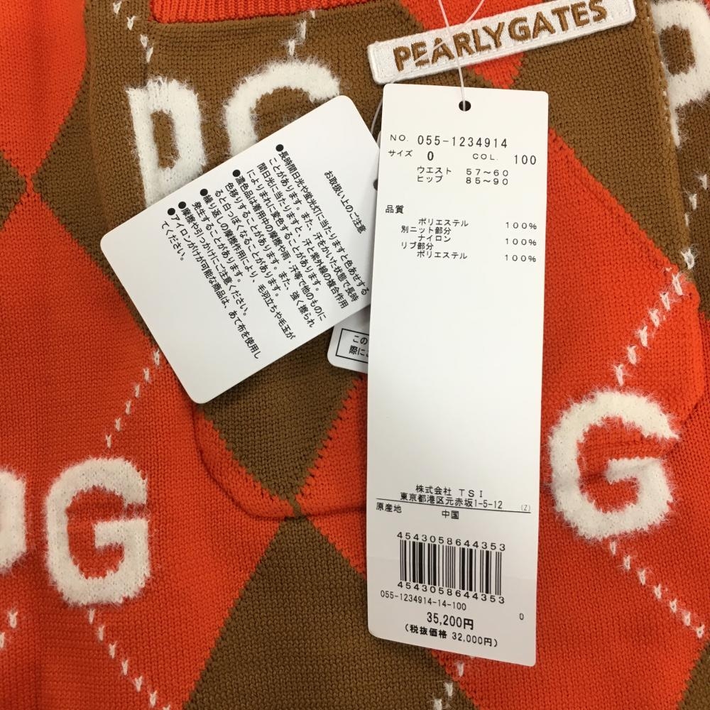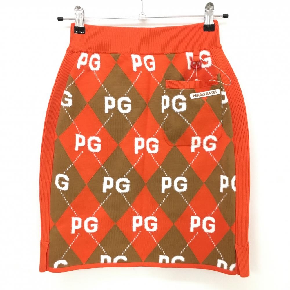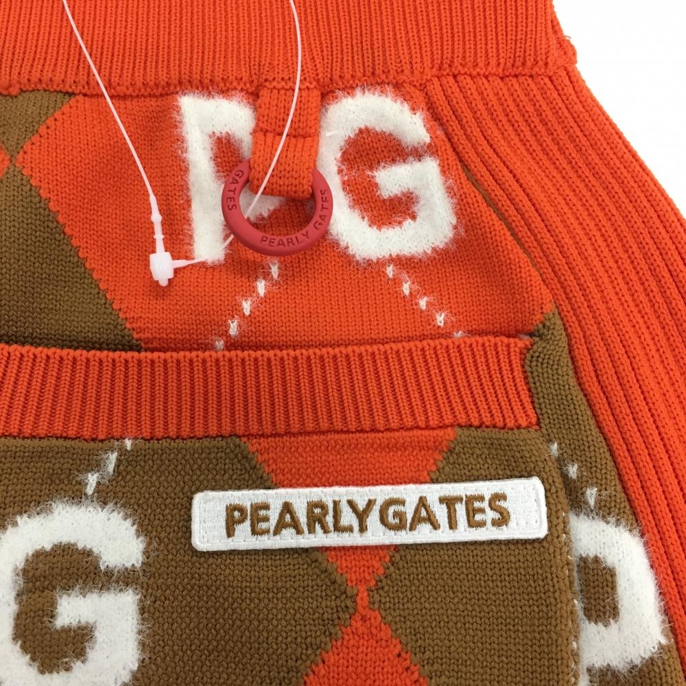 【新品】パーリーゲイツ ニットスカート オレンジ×ブラウン アーガイル柄 ロゴ ウエストゴム レディース 0(S) ゴルフウェア PEARLY GATES