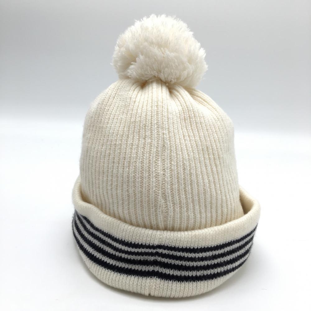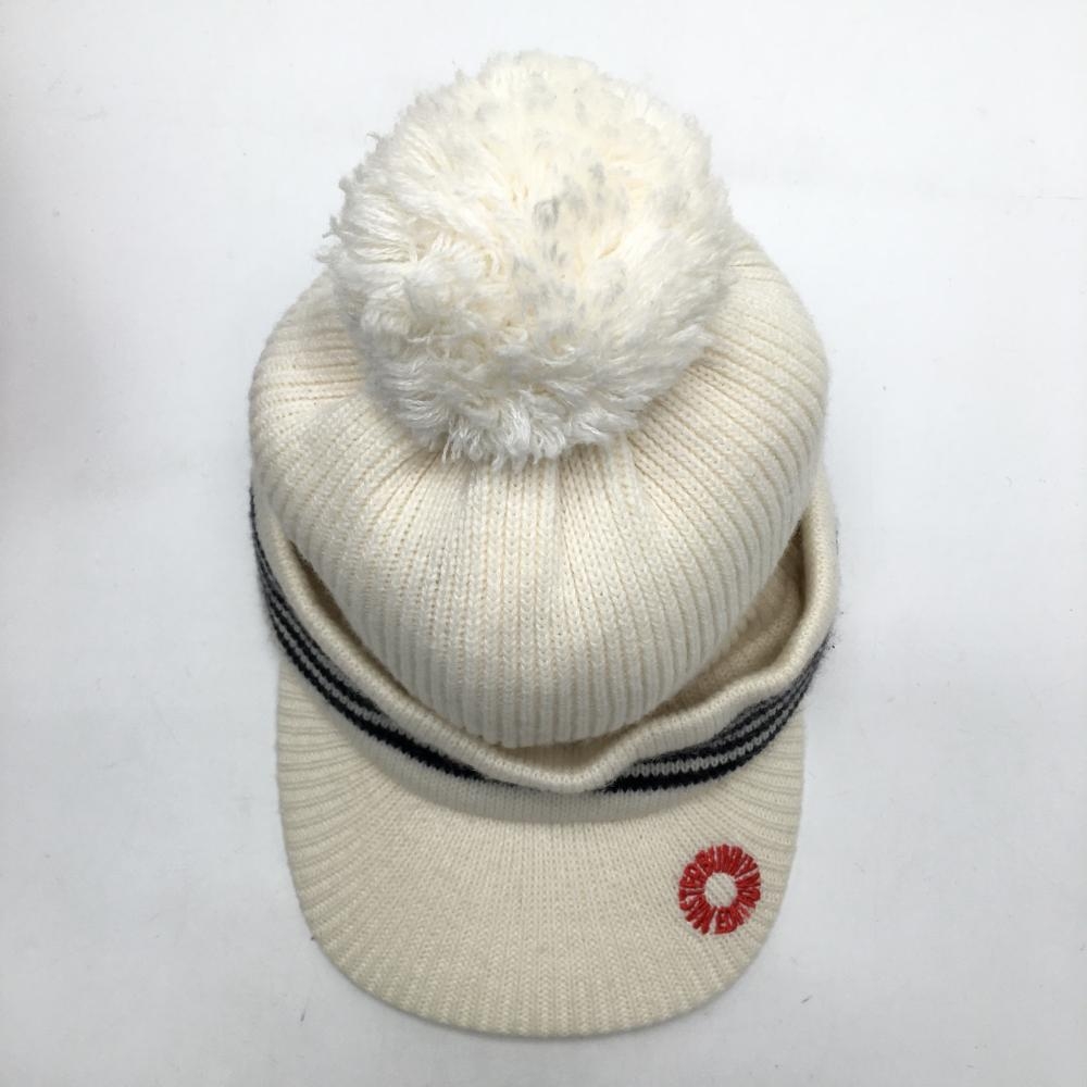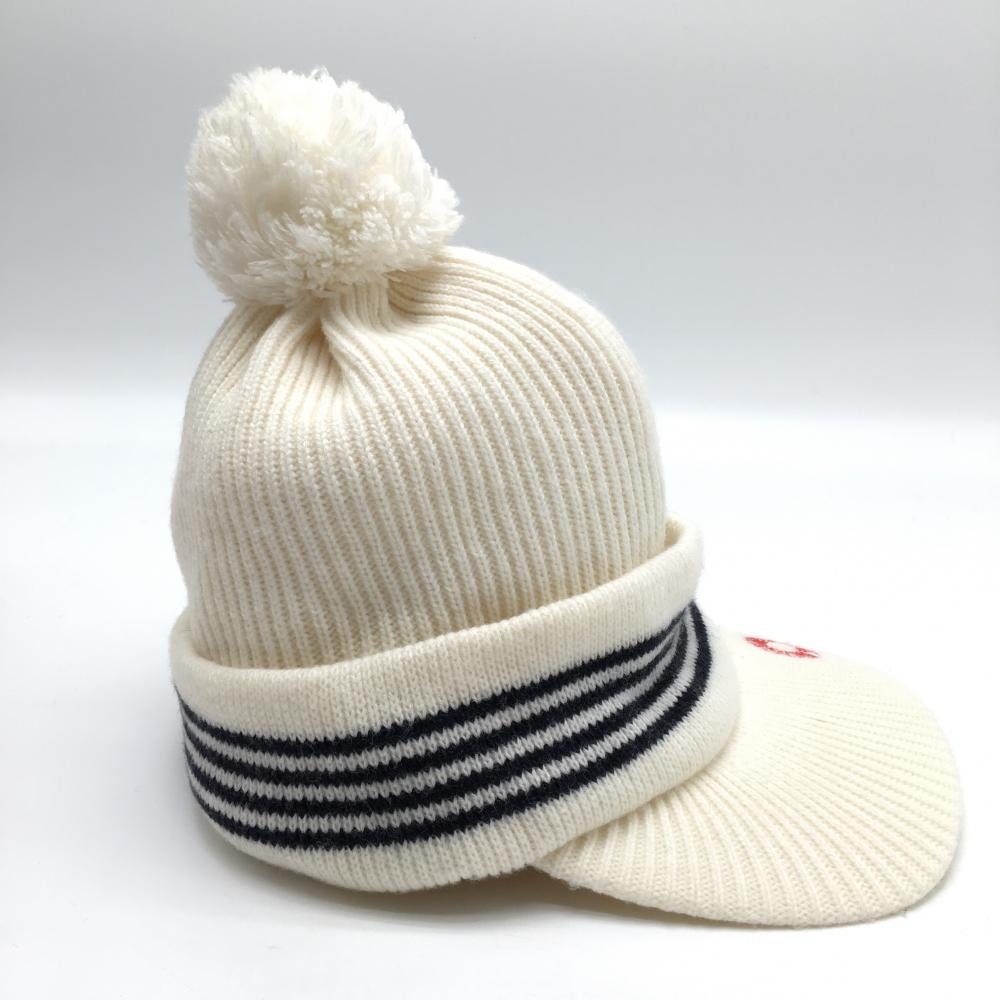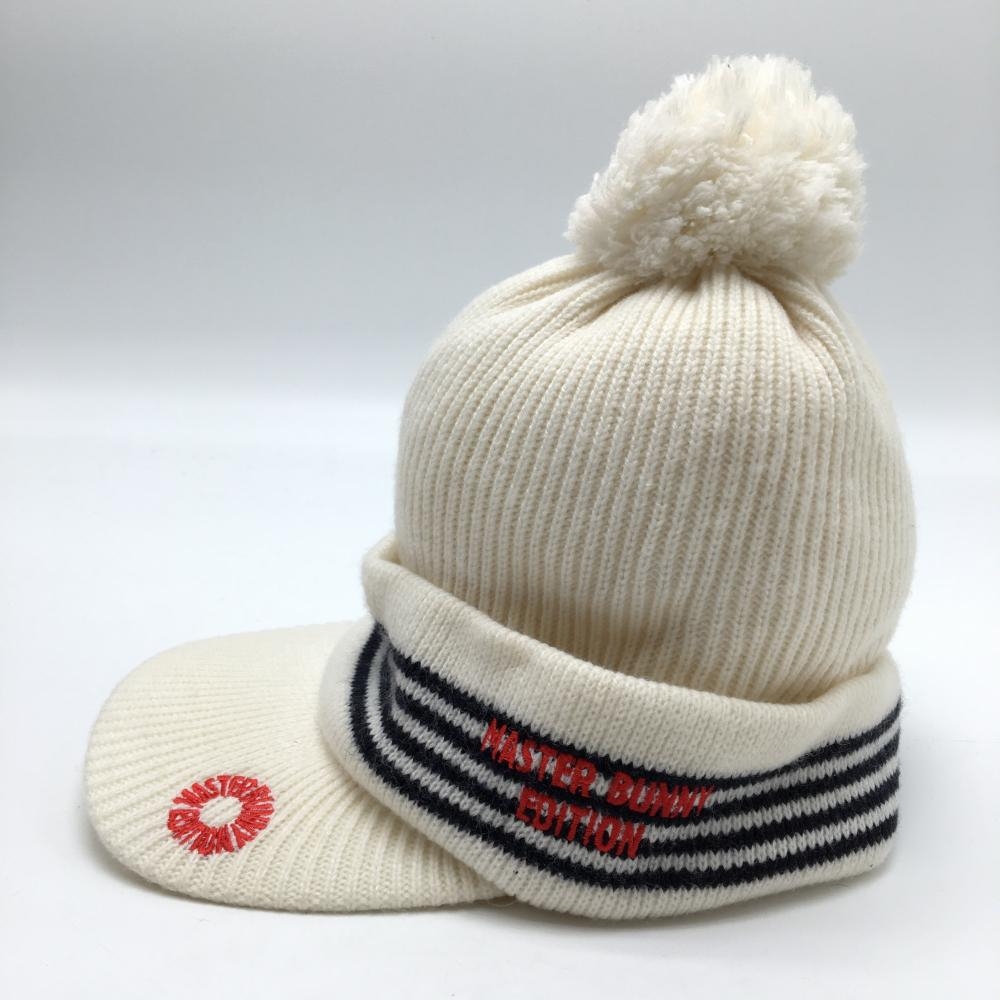 【美品】マスターバニー つば付ニット帽 白×ネイビー 一部ボーダー ウール混 裏起毛 ボンボン付 FR ゴルフウェア MASTER BUNNY EDITION