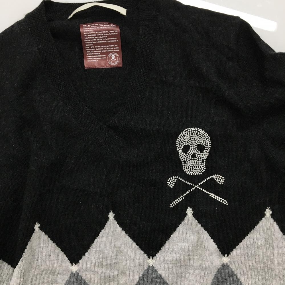 【超美品】マークアンドロナ セーター ダークグレー Vネック スカル ラインストーン 薄手 ニット レディース S ゴルフウェア MARK&LONA