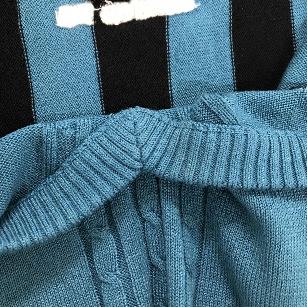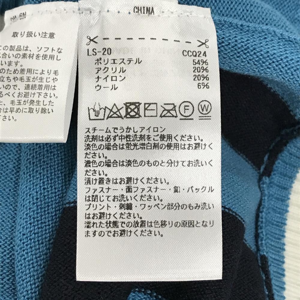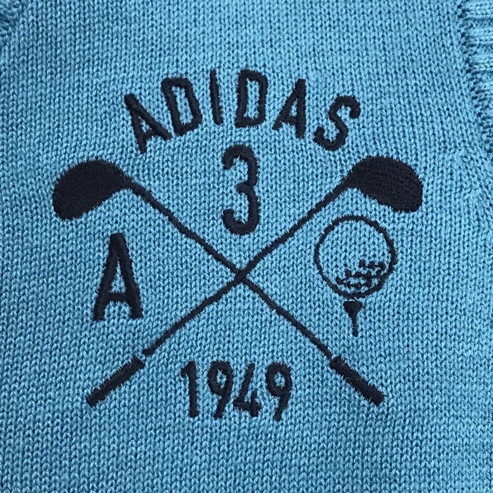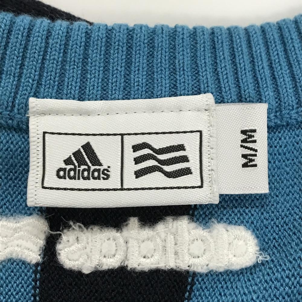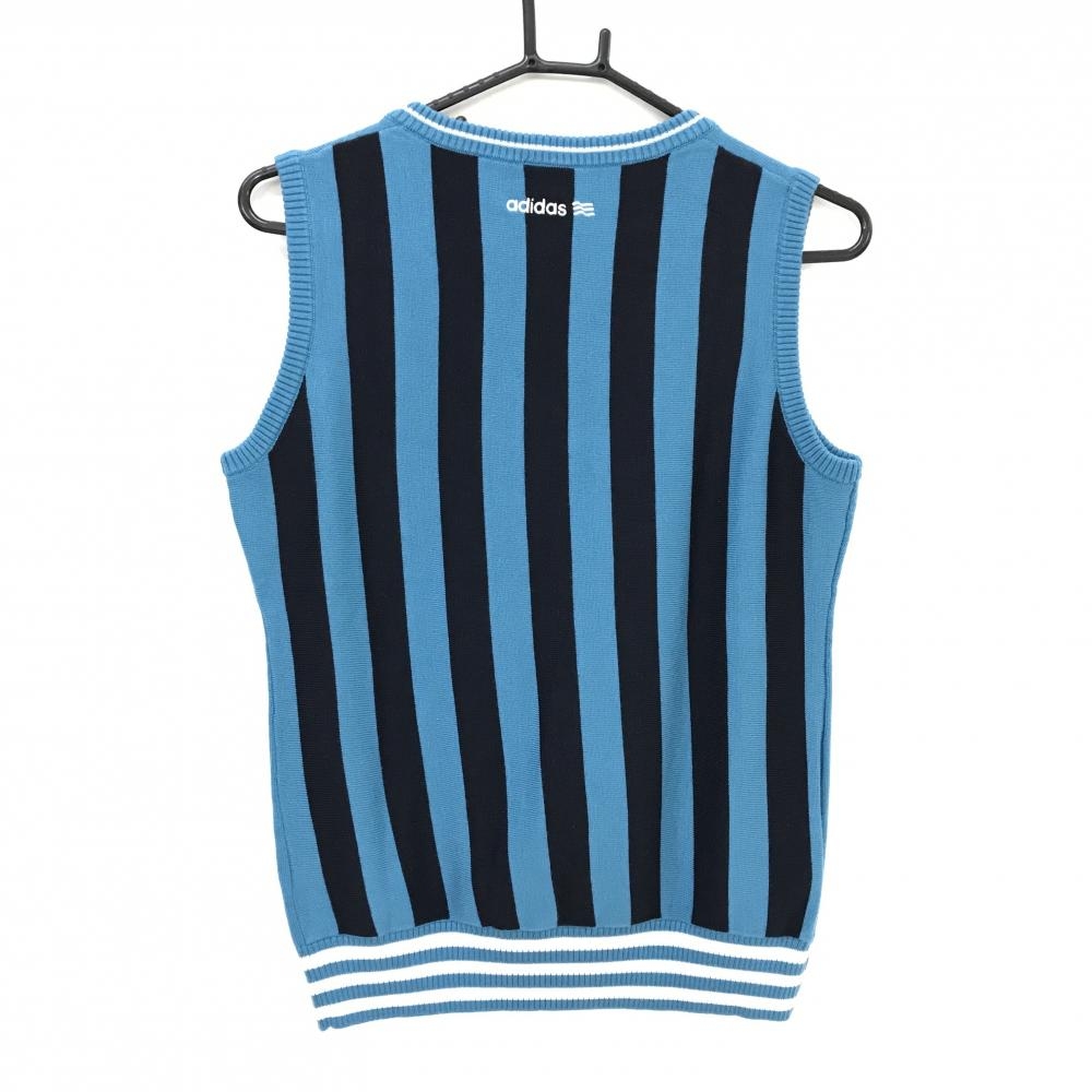 【美品】アディダス ニットベスト ライトブルー×ネイビー ケーブル編み 背面ストライプ Vネック レディース M/M ゴルフウェア adidas