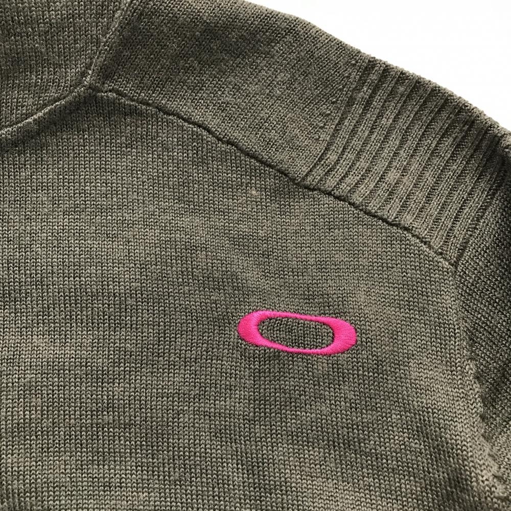 【美品】オークリー ニットジップパーカー カーキグレー×ピンク ロゴ刺しゅう ウール混 メンズ XL ゴルフウェア Oakley