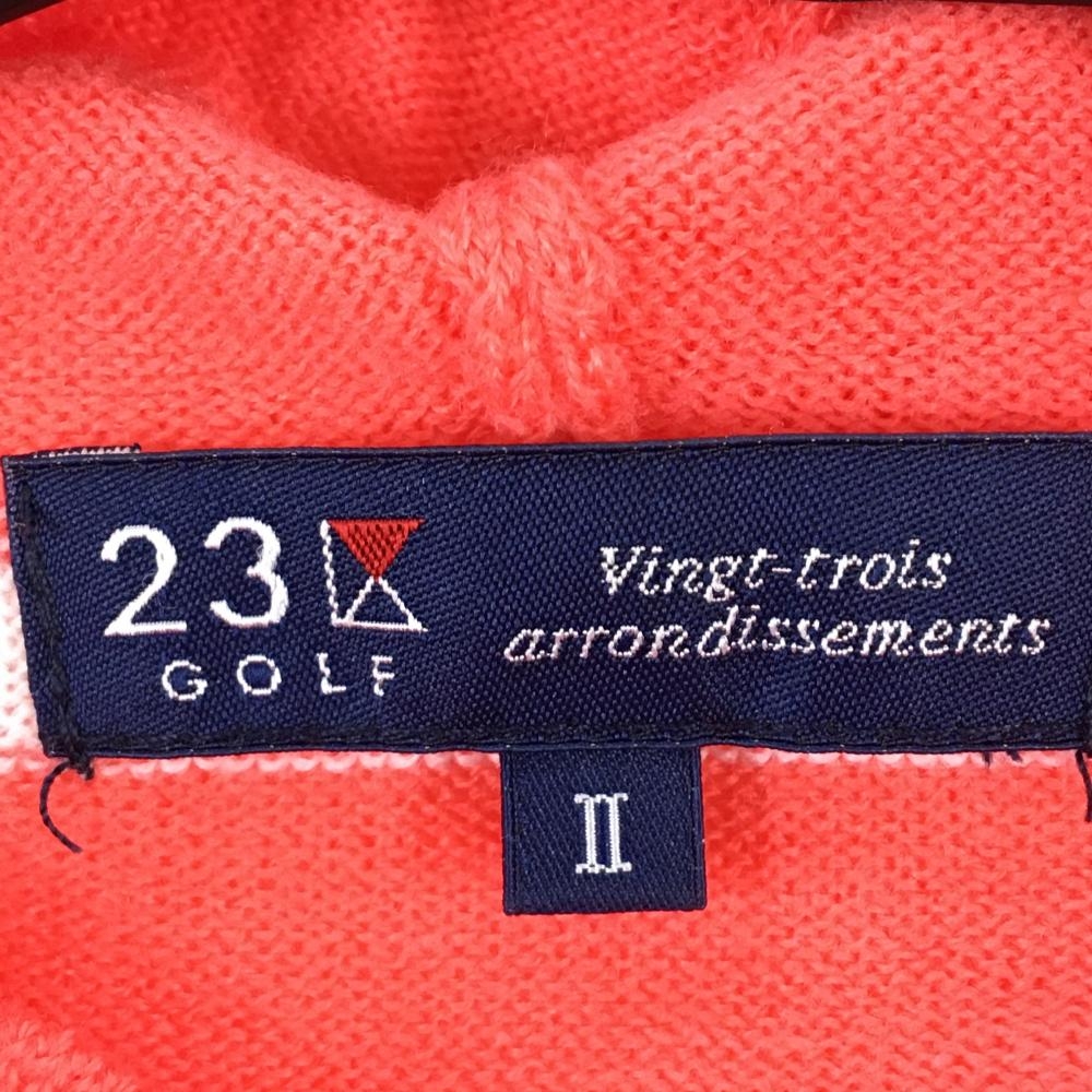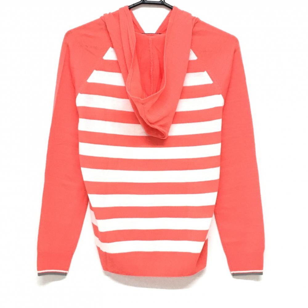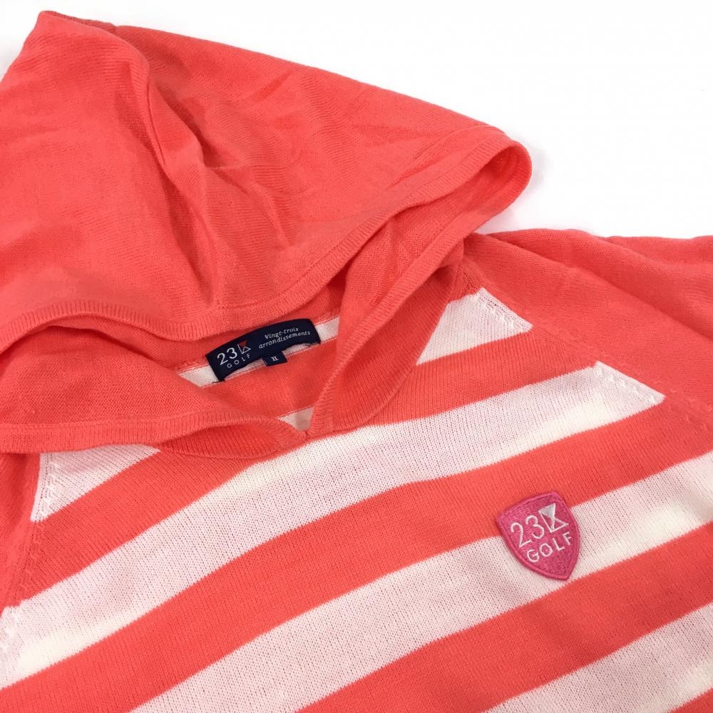 【超美品】23区ゴルフ フード付セーター サーモンピンク×白 身頃ボーダー ニット レディース II(L) ゴルフウェア 23区