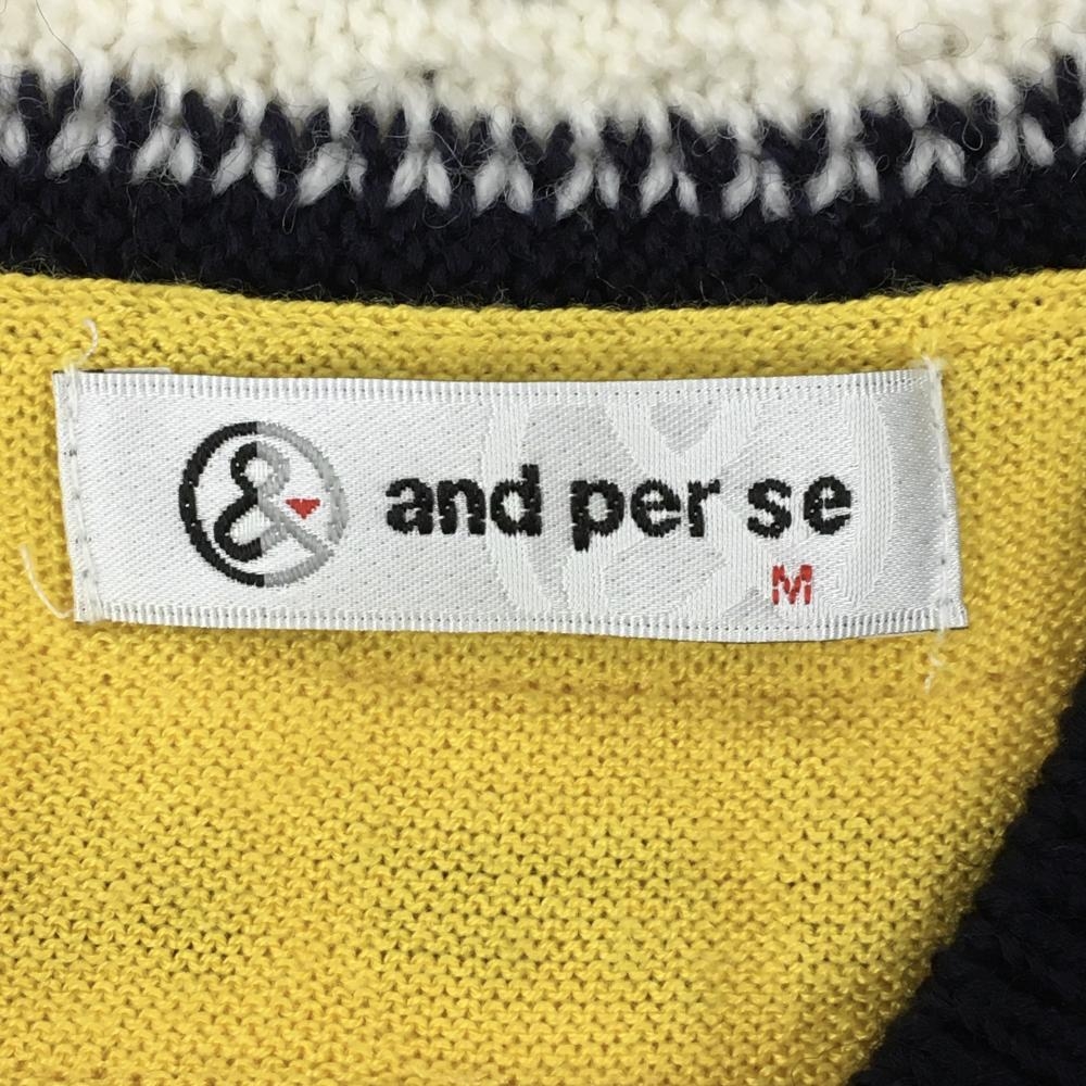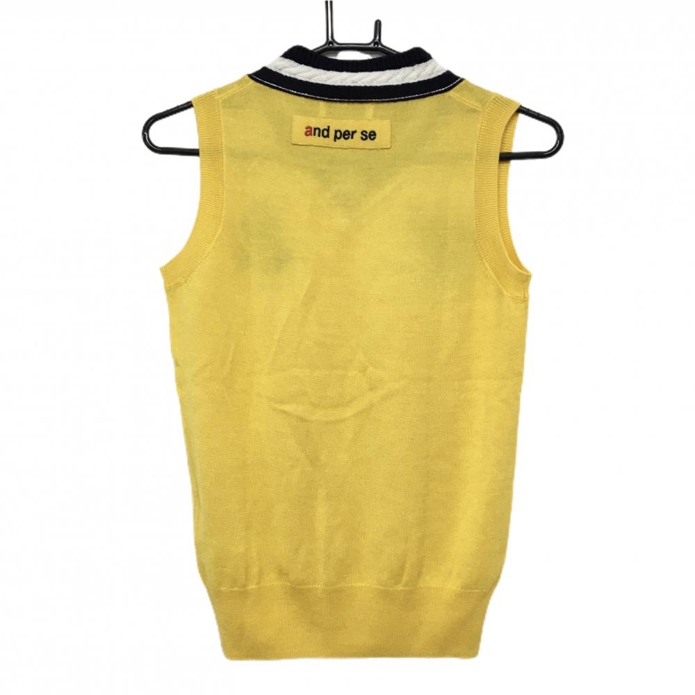 【美品】アンパスィ ニットベスト イエロー×ネイビー 襟元ケーブル編み ウール混 レディース M ゴルフウェア and per se