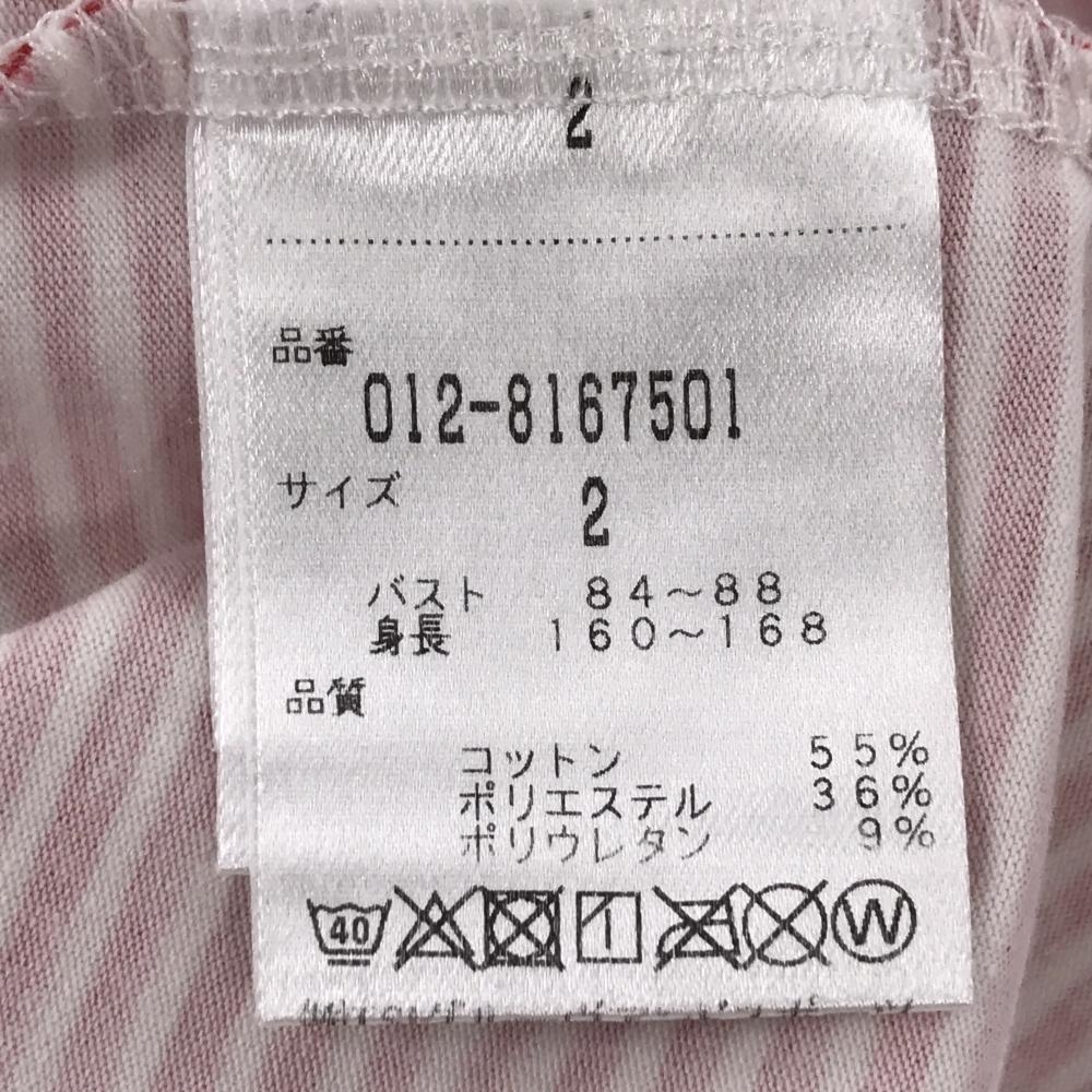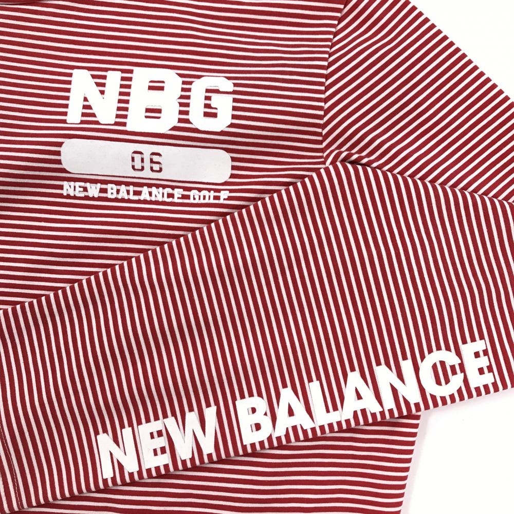 【美品】ニューバランスゴルフ 長袖ハイネックシャツ レッド×白 ボーダー 袖ロゴ レディース 2(L) ゴルフウェア New Balance