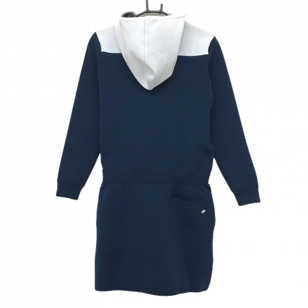 【超美品】フィドラ フード付長袖ニットワンピース ネイビー×白 フロントロゴ ウエストゴム レディース L/G ゴルフウェア FIDRA
