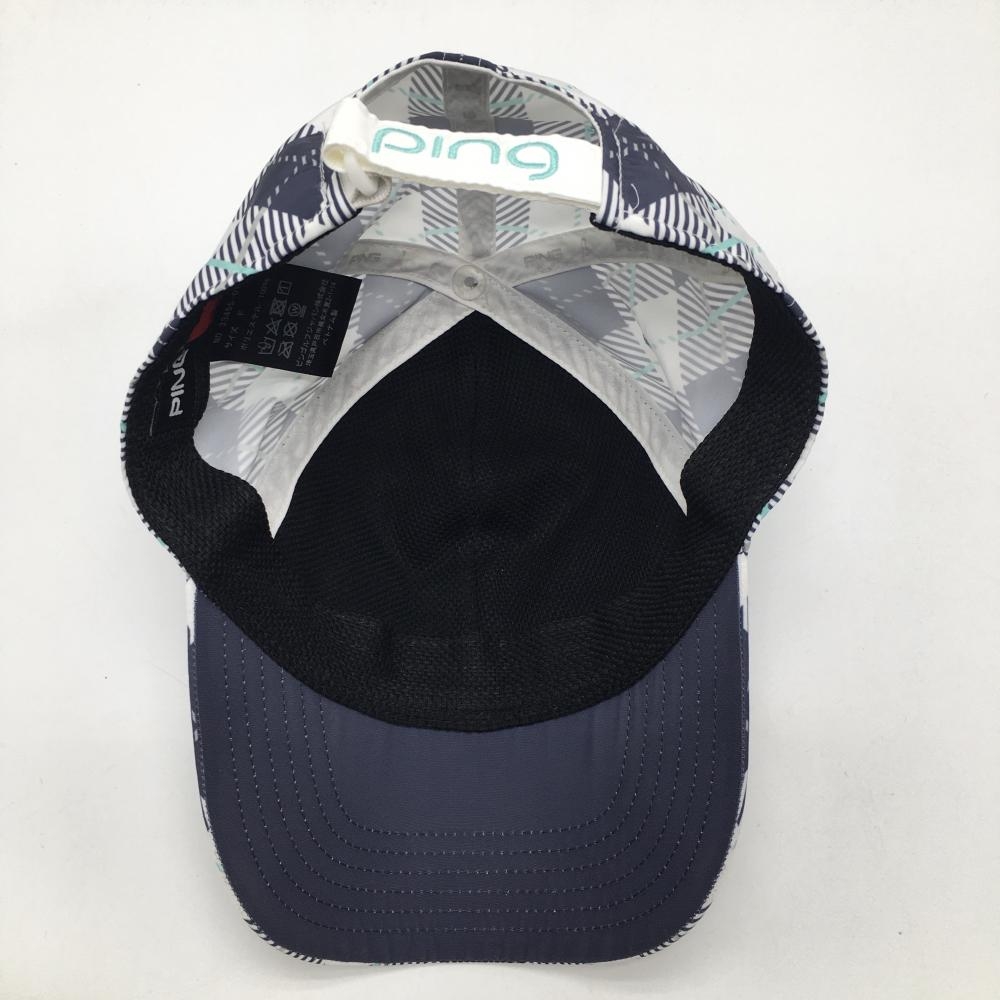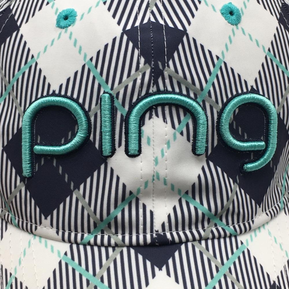 【超美品】ピン キャップ 白×ネイビー×ミントブルー チェック 立体ロゴ ONE SIZU ゴルフウェア PING