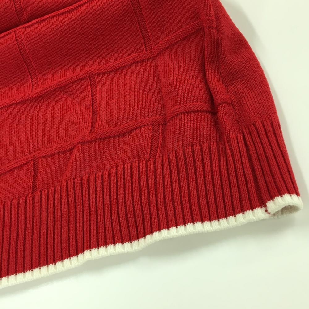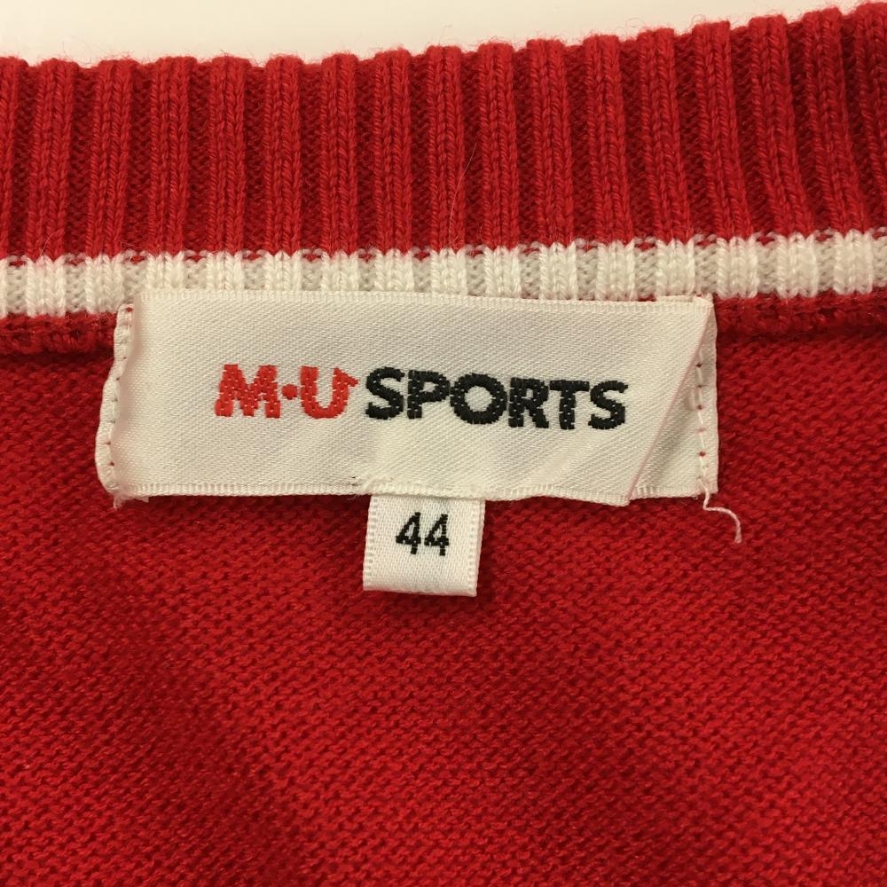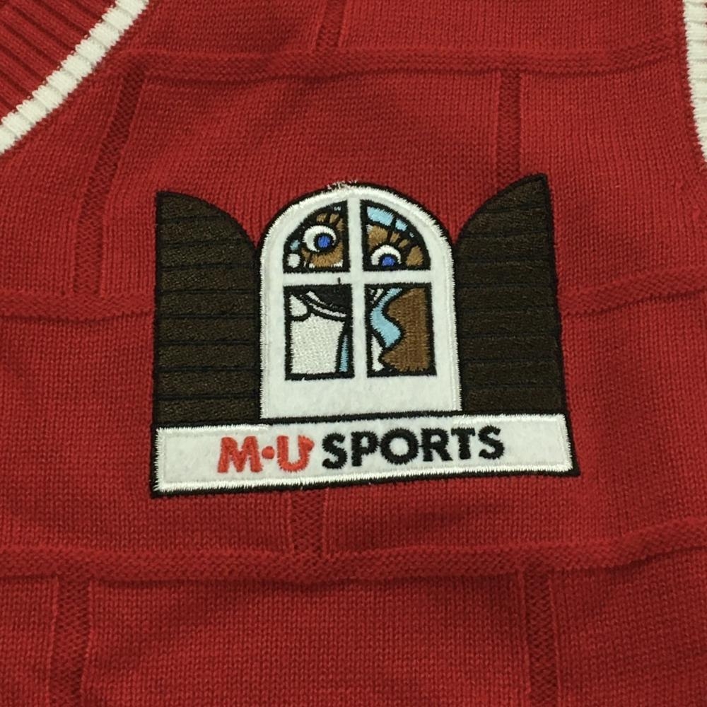 【美品】MUスポーツ ニットベスト レッド×白 地模様 胸元刺しゅう Vネック ウール混 レディース 44(XL) ゴルフウェア M・U SPORTS