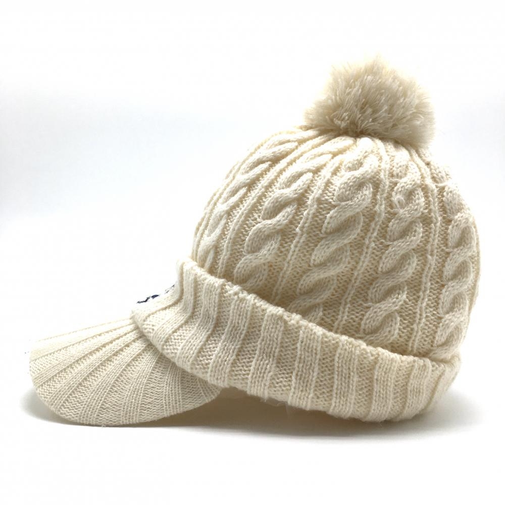 【美品】アドミラル つば付きニット帽 アイボリー ケーブル編み ボンボン付 FREE ゴルフウェア Admiral