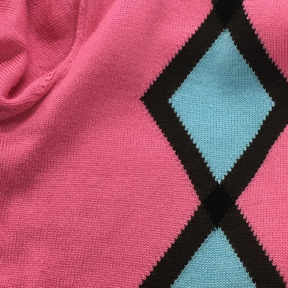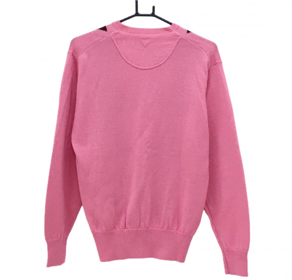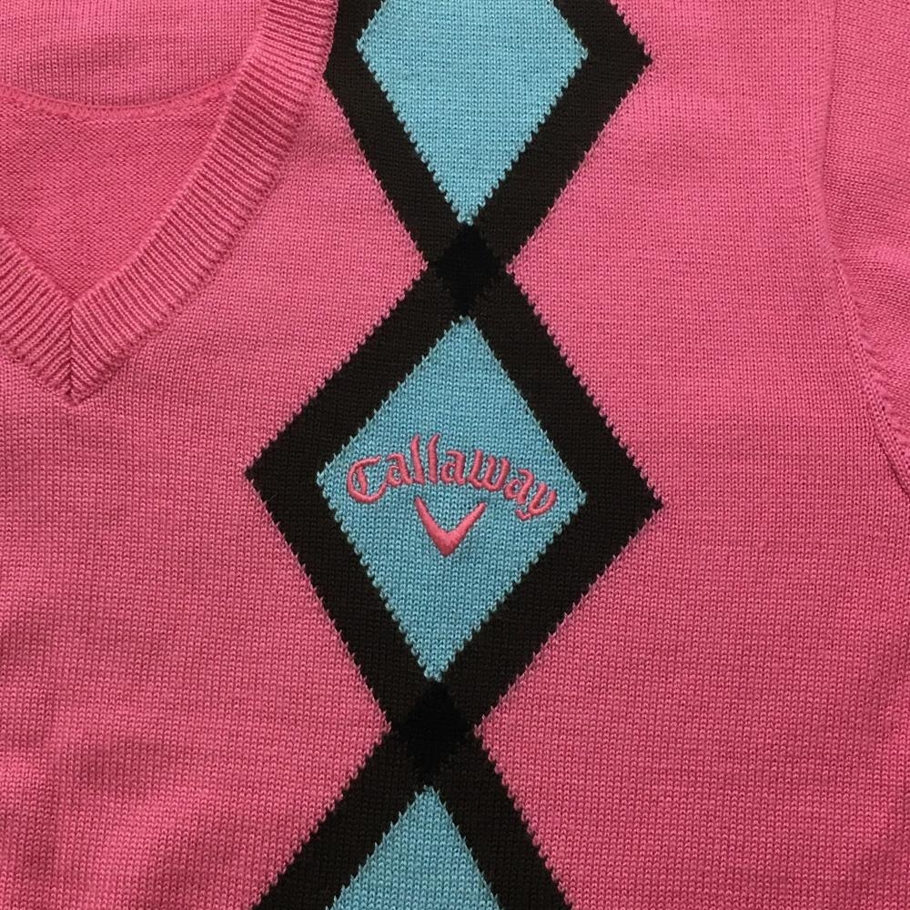 【美品】キャロウェイ セーター ピンク×ライトブルー フロントアーガイル風 胸ロゴ ウール混 Vネック メンズ M ゴルフウェア Callaway