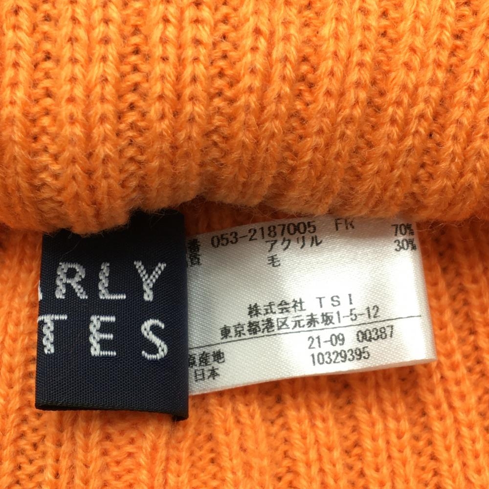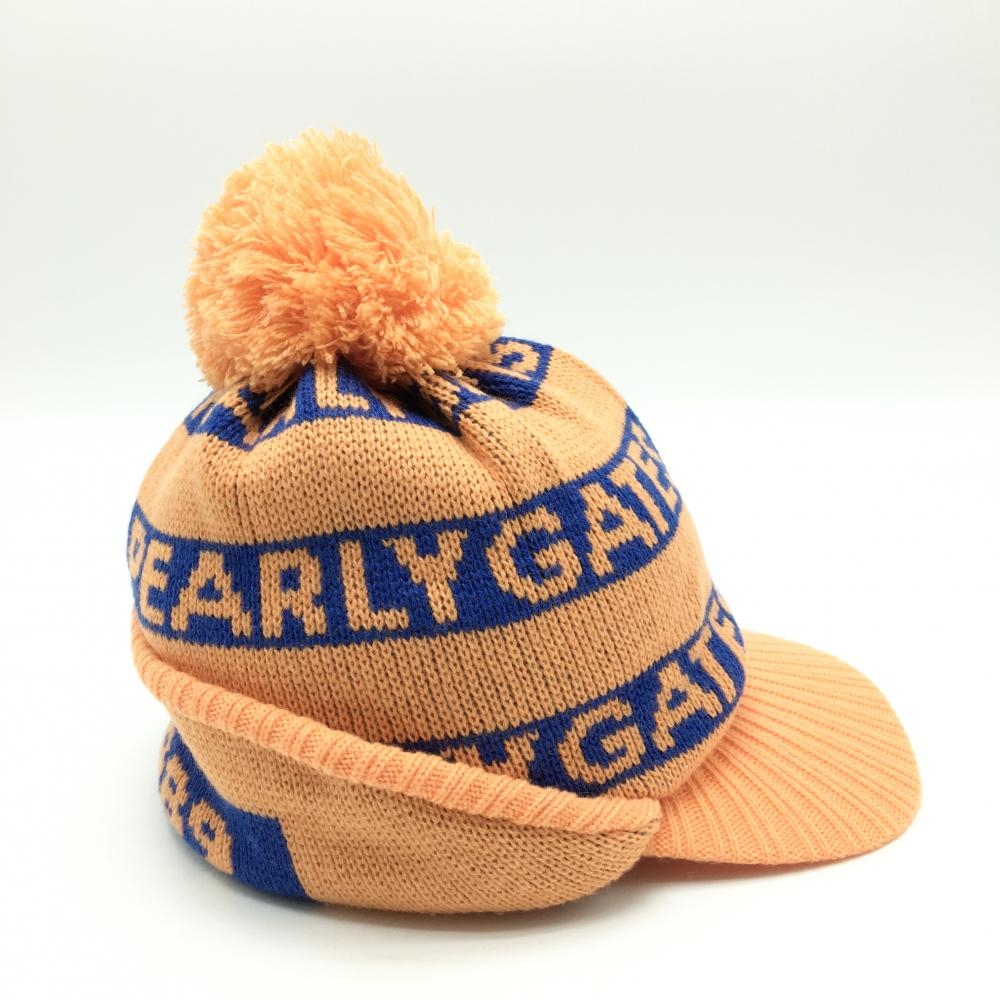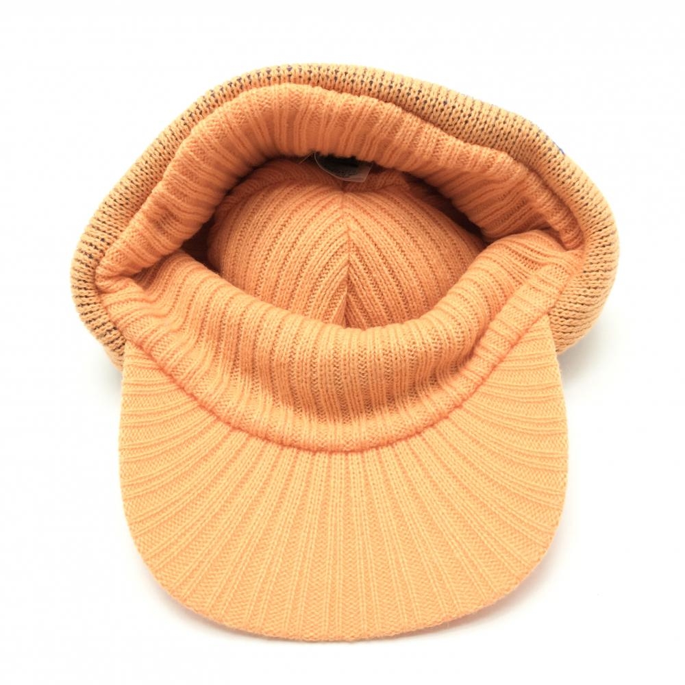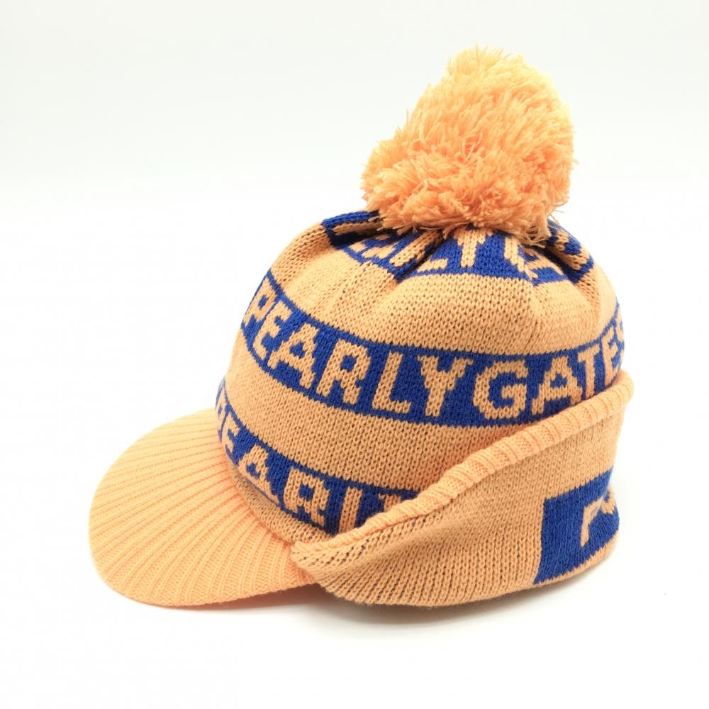 【超美品】パーリーゲイツ つば付ニット帽 オレンジ×ブルー ウール混 耳当て付 ボンボン付 FR ゴルフウェア PEARLY GATES