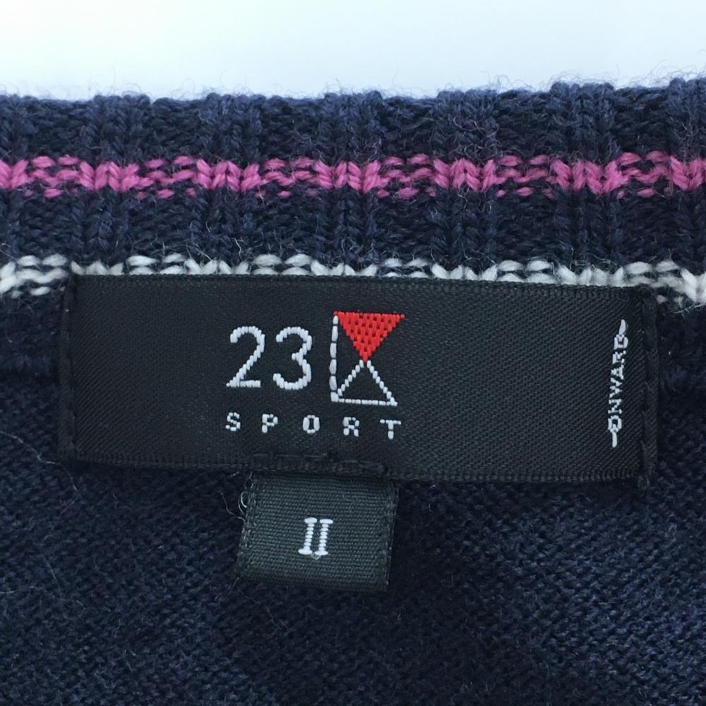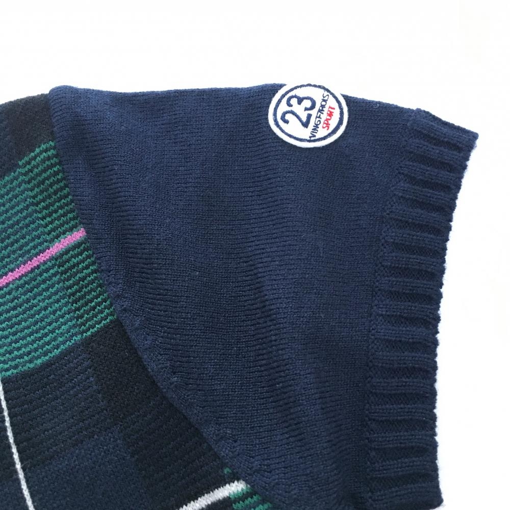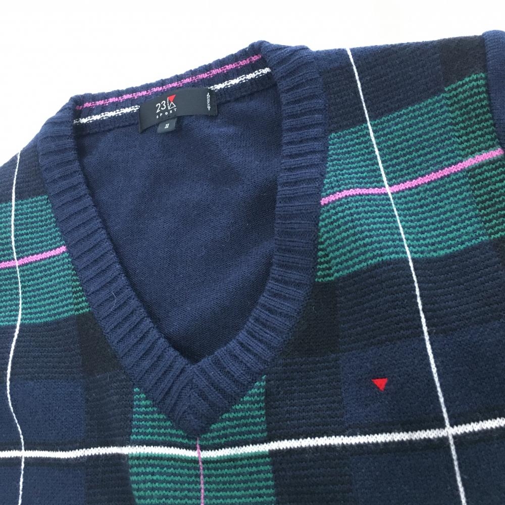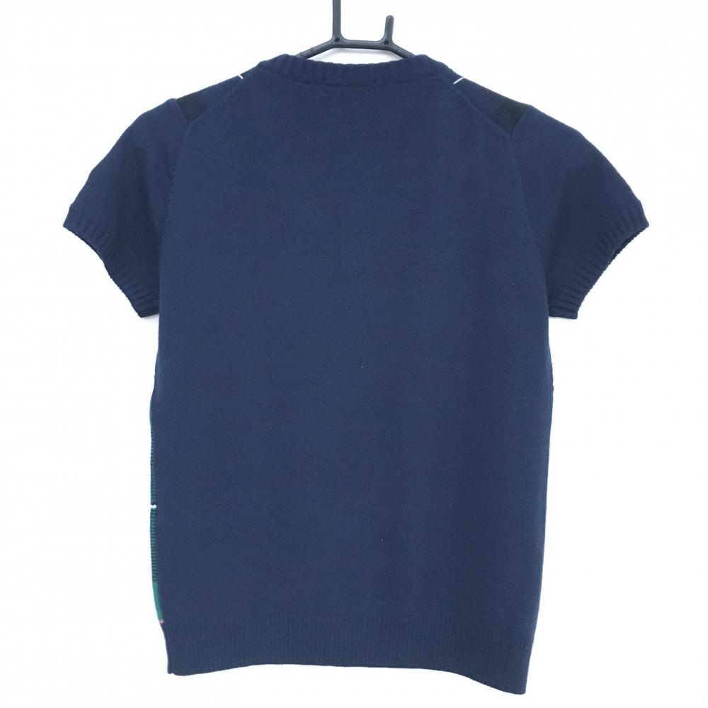 【超美品】23区スポーツ 半袖セーター ネイビー×グリーン チェック柄 ウール混 ニット レディース II(L) ゴルフウェア 23区