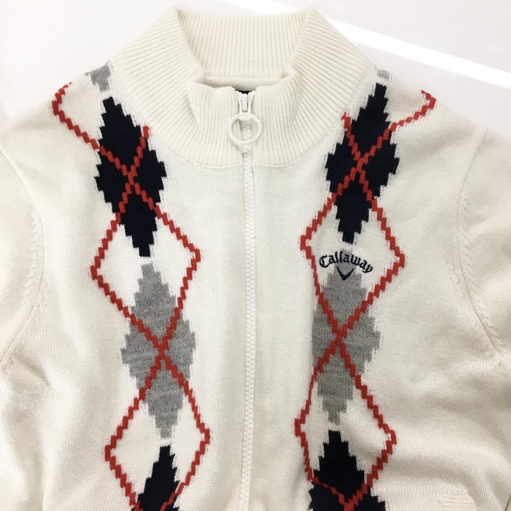 【美品】キャロウェイ ニットジャケット 白×レッド×ネイビー 前面アーガイル調 ウール混 レディース M ゴルフウェア Callaway