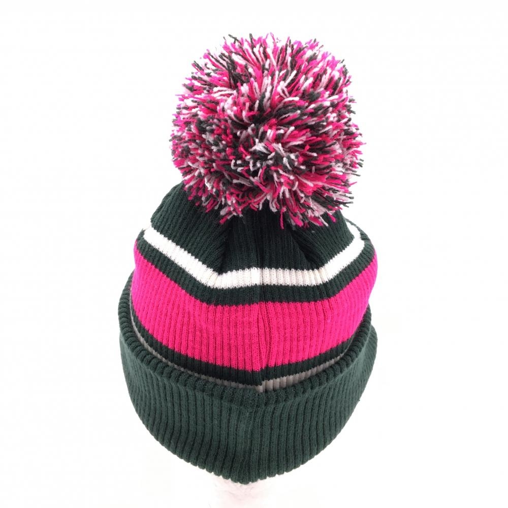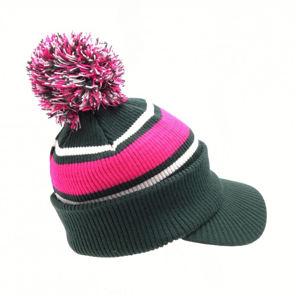 【超美品】ジャックバニー つば付ニット帽 グリーン×ピンク ボンボン付 裏フリース FR ゴルフウェア Jack Bunny