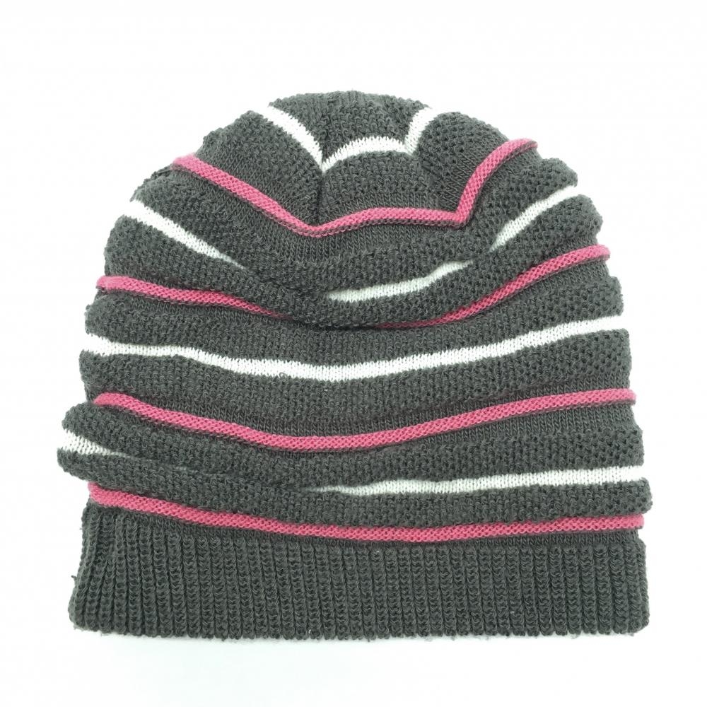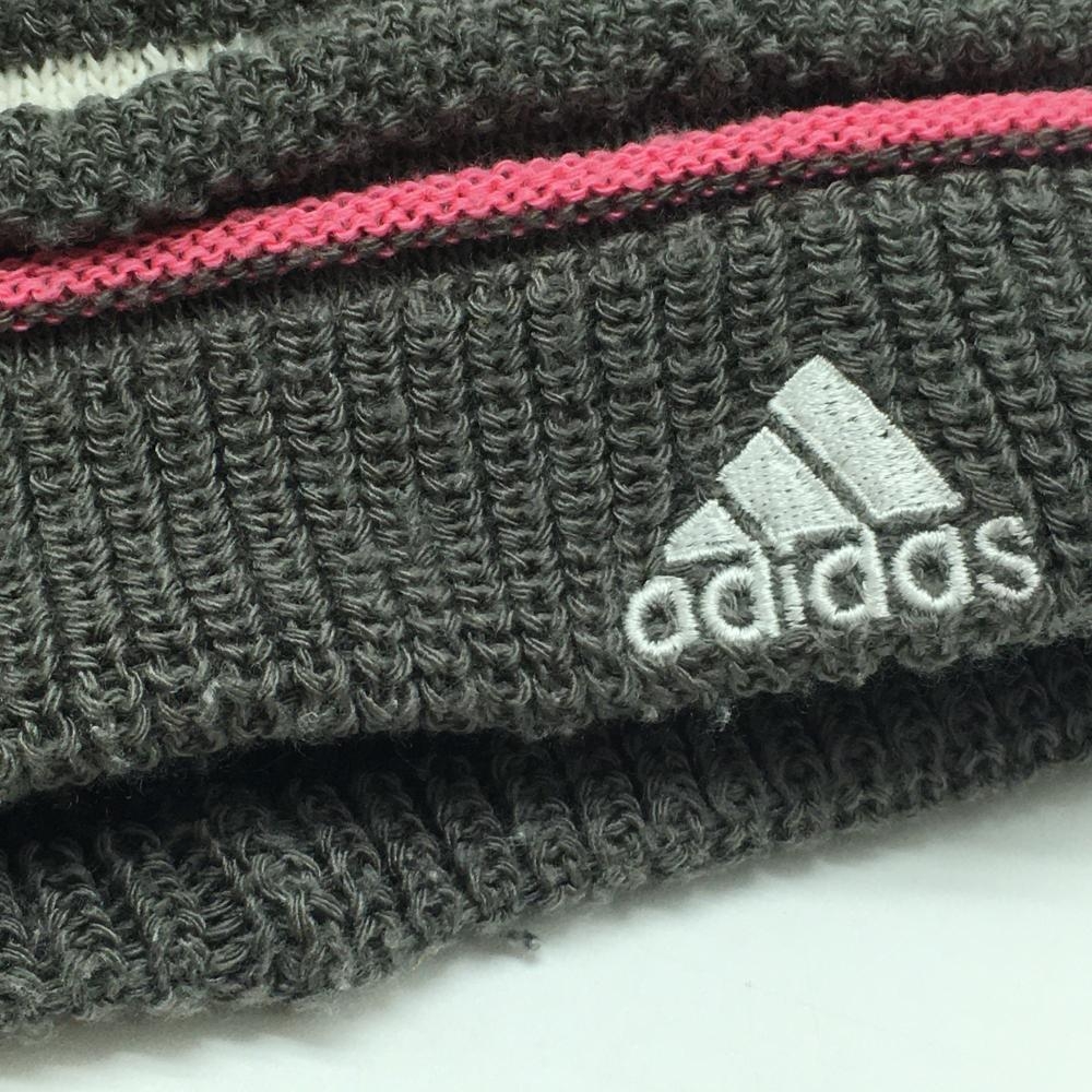 【美品】アディダス ニット帽 グレー×ピンク ボーダー ロゴ刺しゅう 裏ボア フリー(57-59cm) ゴルフウェア adidas