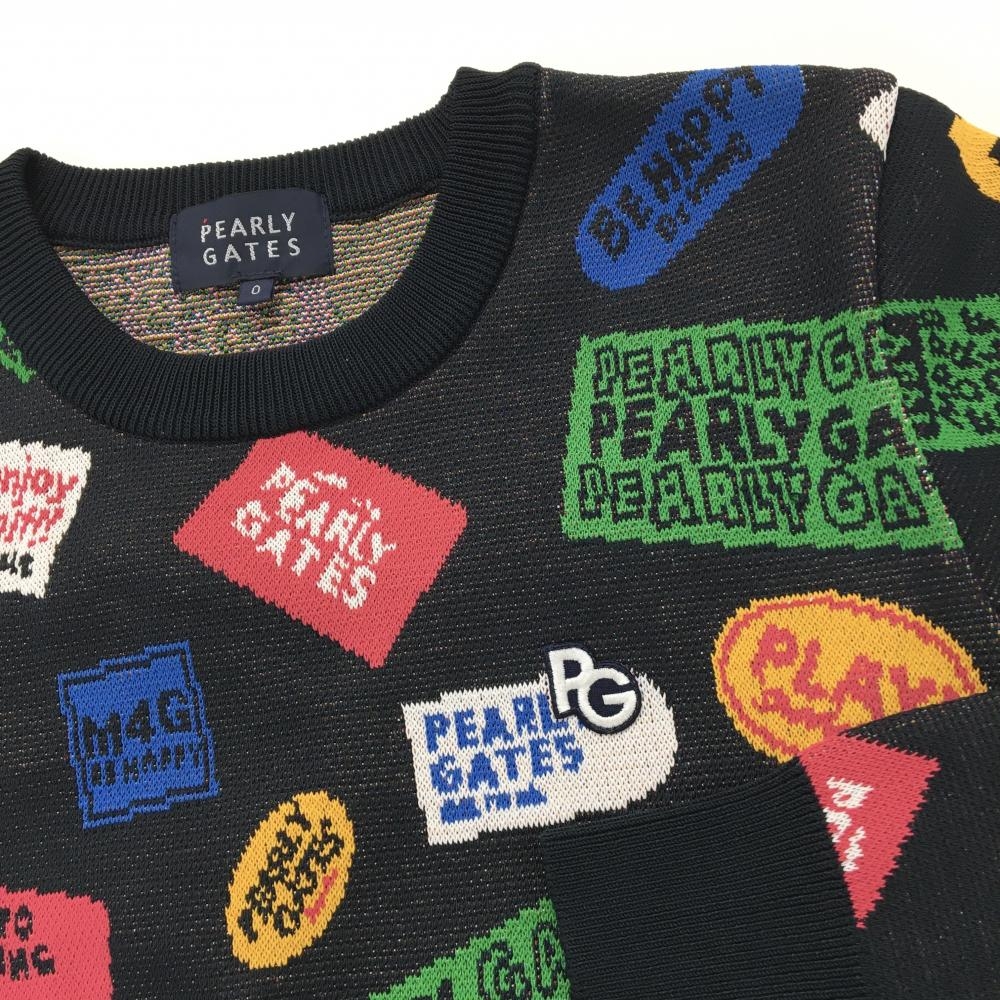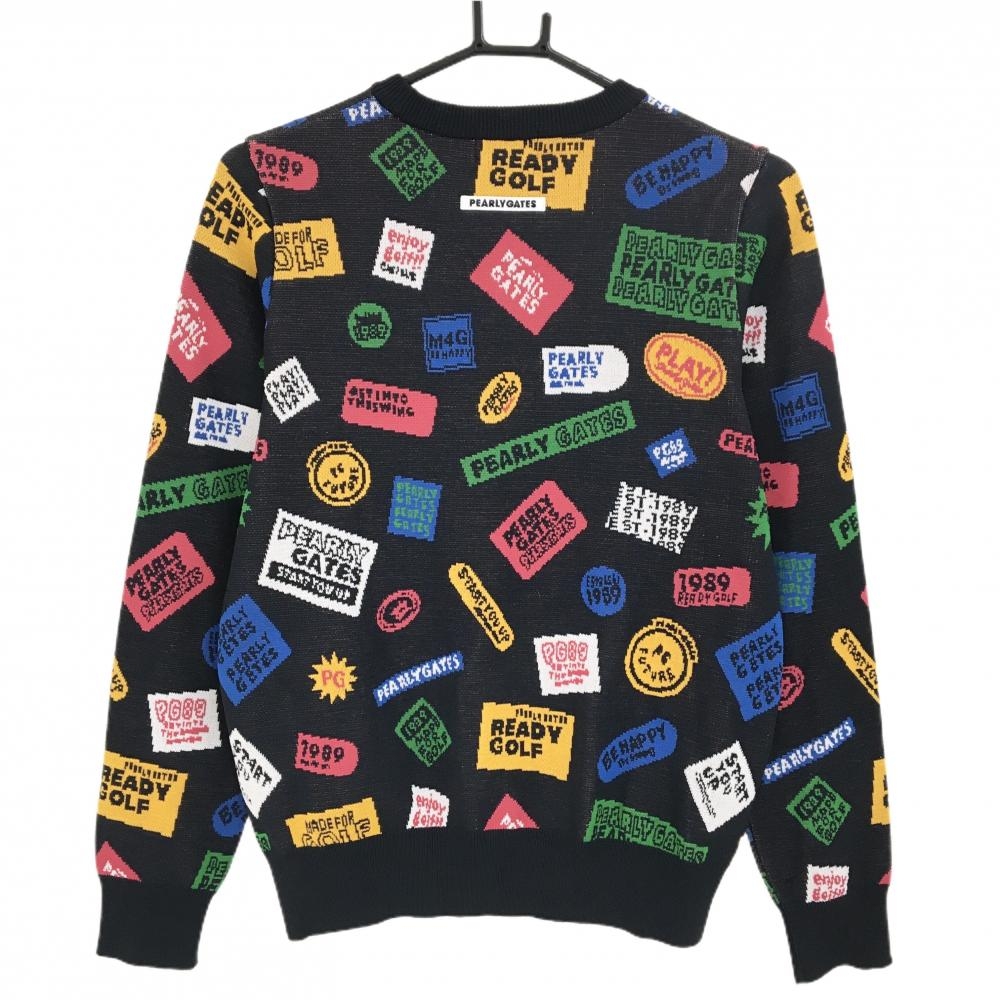 【超美品】パーリーゲイツ セーター ネイビー×マルチカラー ロゴ総柄 ワッペン ニット レディース 0(S) ゴルフウェア PEARLY GATES