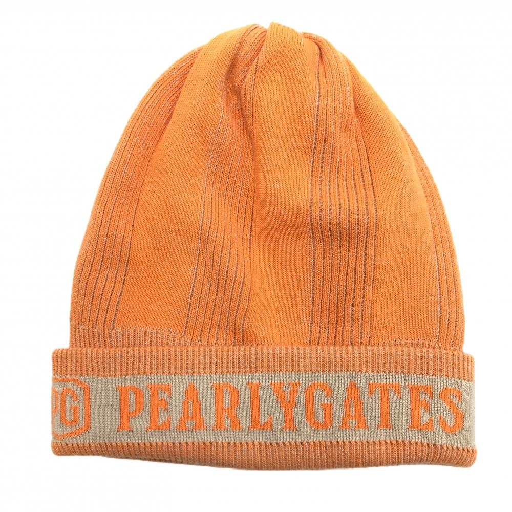 【美品】パーリーゲイツ ニット帽 オレンジ×ベージュ ロゴ コットン混 毛羽立ち少 FR ゴルフウェア PEARLY GATES