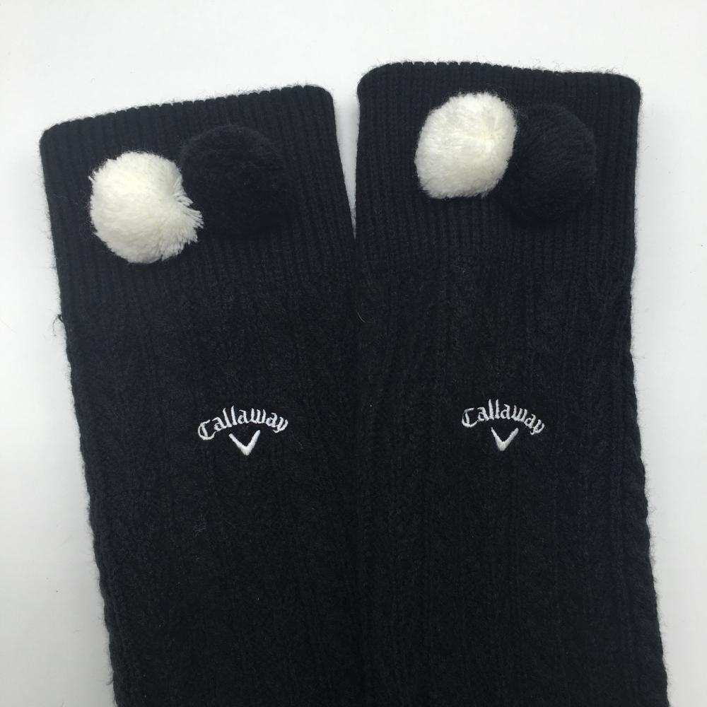 【美品】キャロウェイ ニットレッグウォーマー 黒 ケーブル編み 裏フリース ボンボン付 レディース ゴルフウェア Callaway