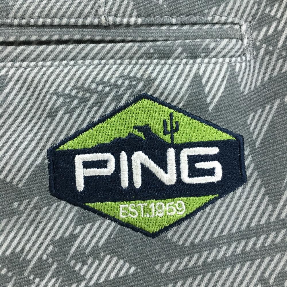 【美品】ピン パンツ ライトグレー×グレー 総柄 ロゴ刺しゅう 裏微起毛 メンズ L ゴルフウェア PING