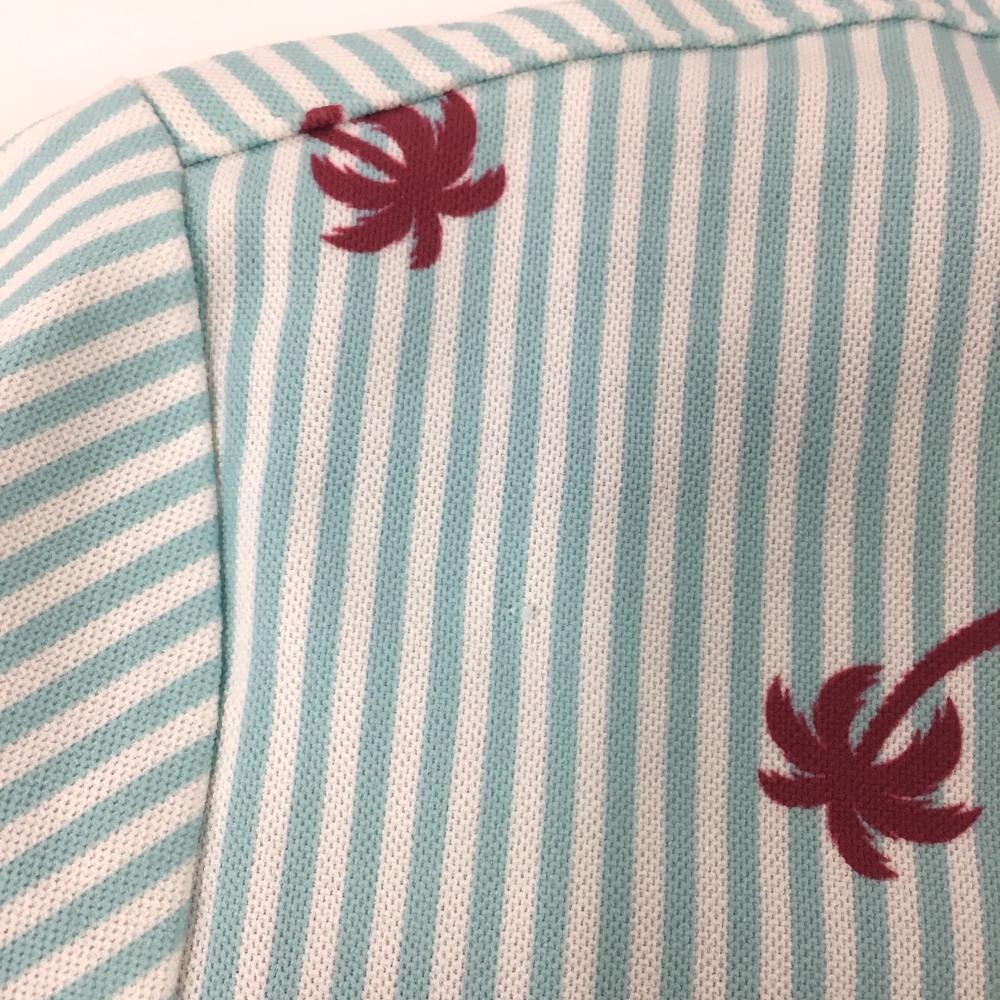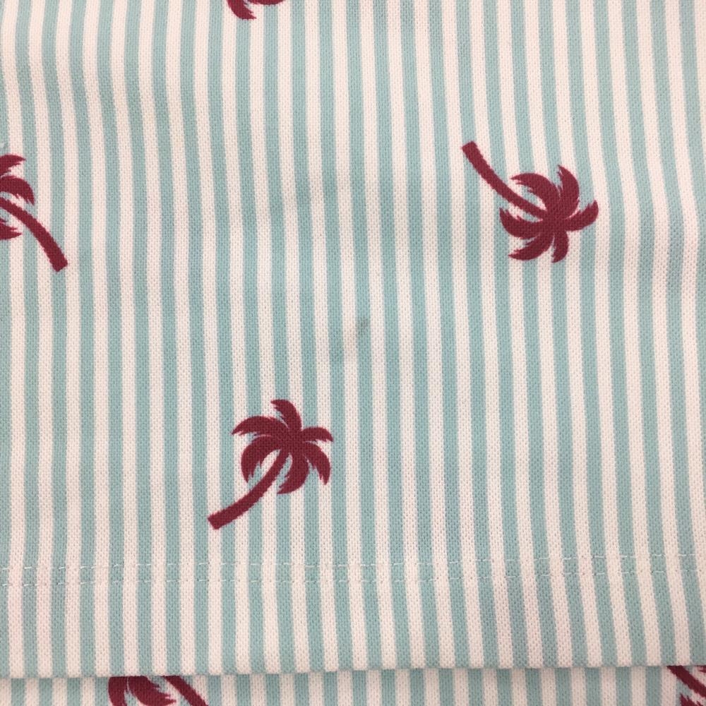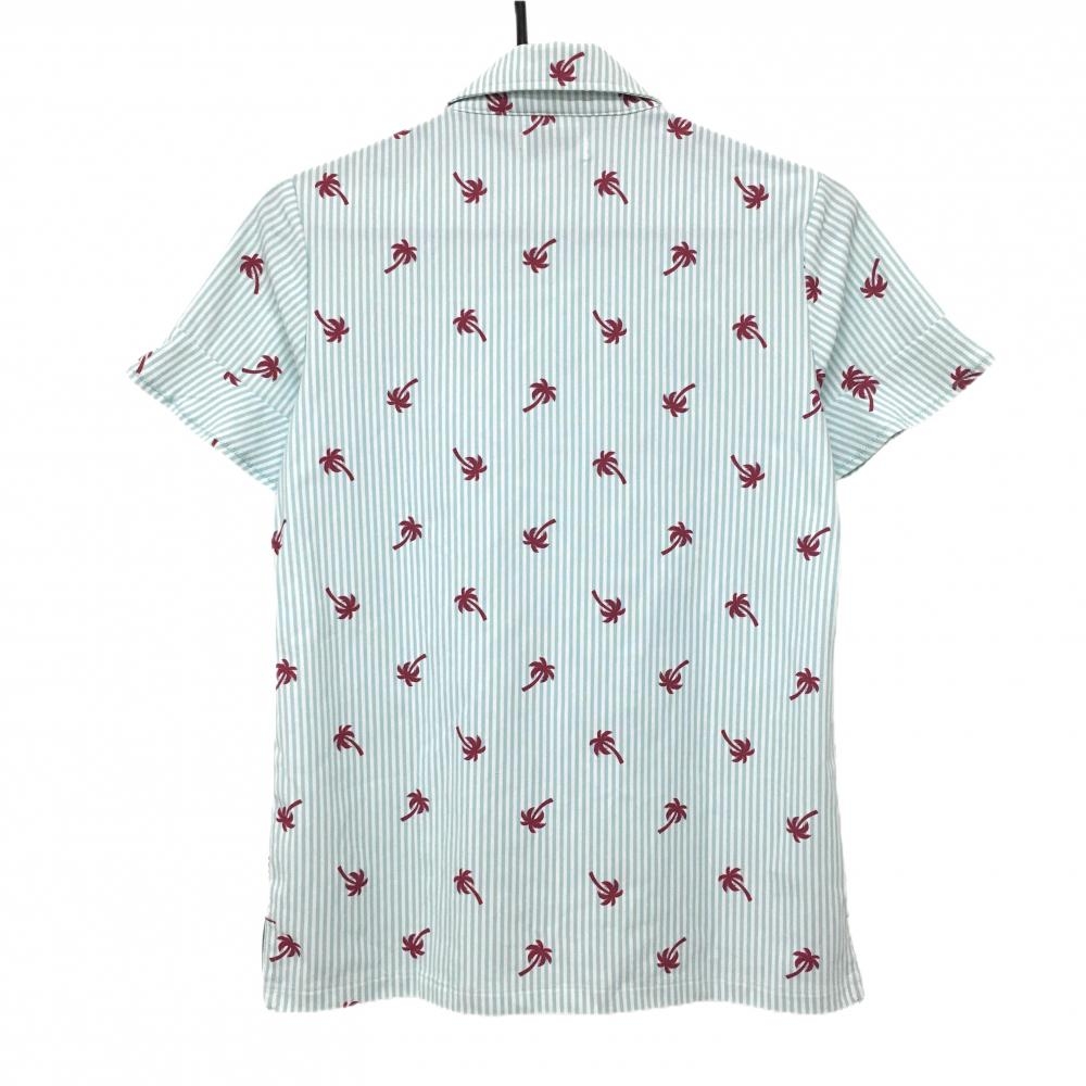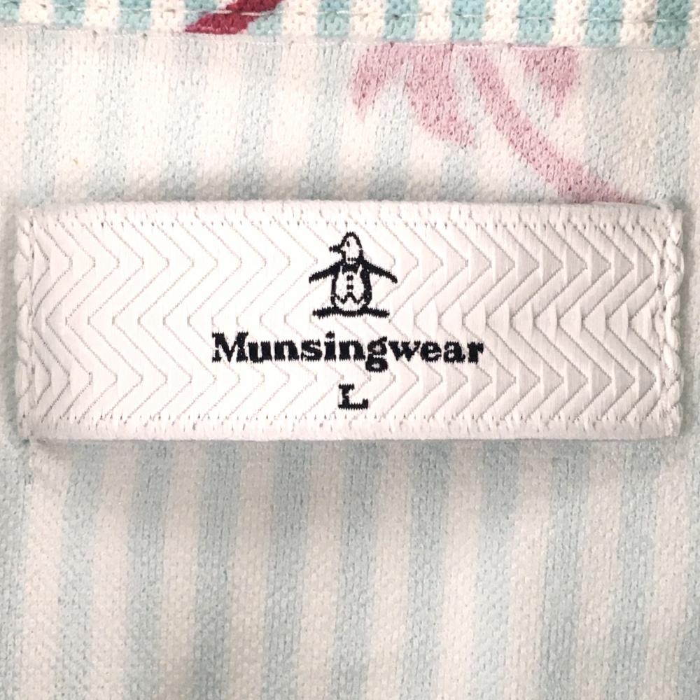 【美品】マンシングウェア 半袖ポロシャツ 白×ライトブルー ストライプ ヤシの木柄 袖フリル レディース L ゴルフウェア Munsingwear