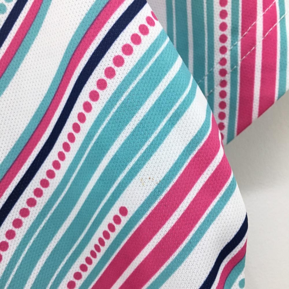 【美品】マリクレールスポール 半袖ハイネックシャツ ミントブルー×ピンク 斜めストライプ レディース LL ゴルフウェア marie claire