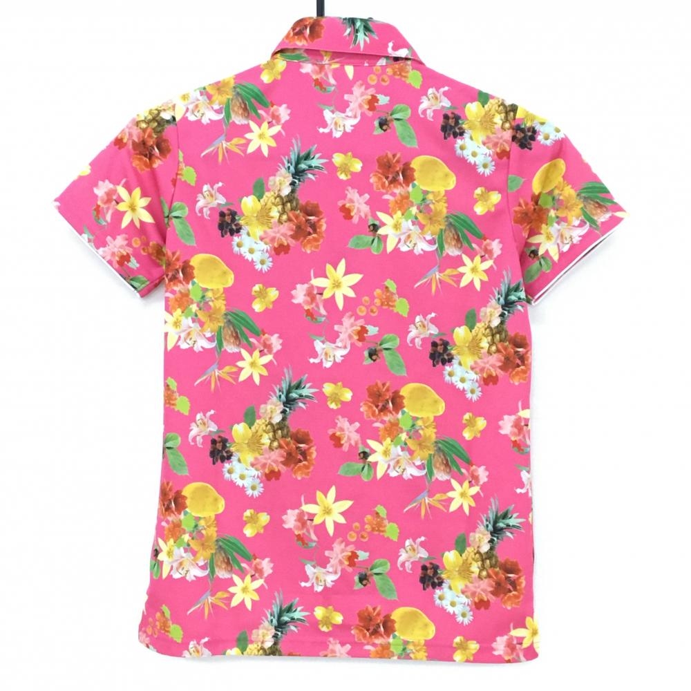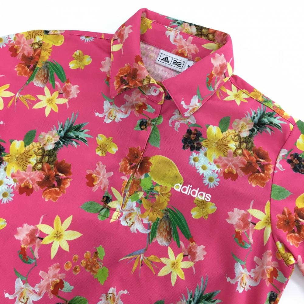 【超美品】アディダス 半袖ポロシャツ ピンク×マルチカラー 花柄 果実 ロゴ刺しゅう レディース S/P ゴルフウェア adidas