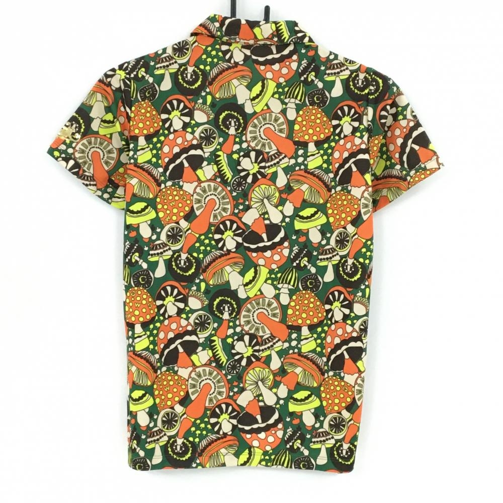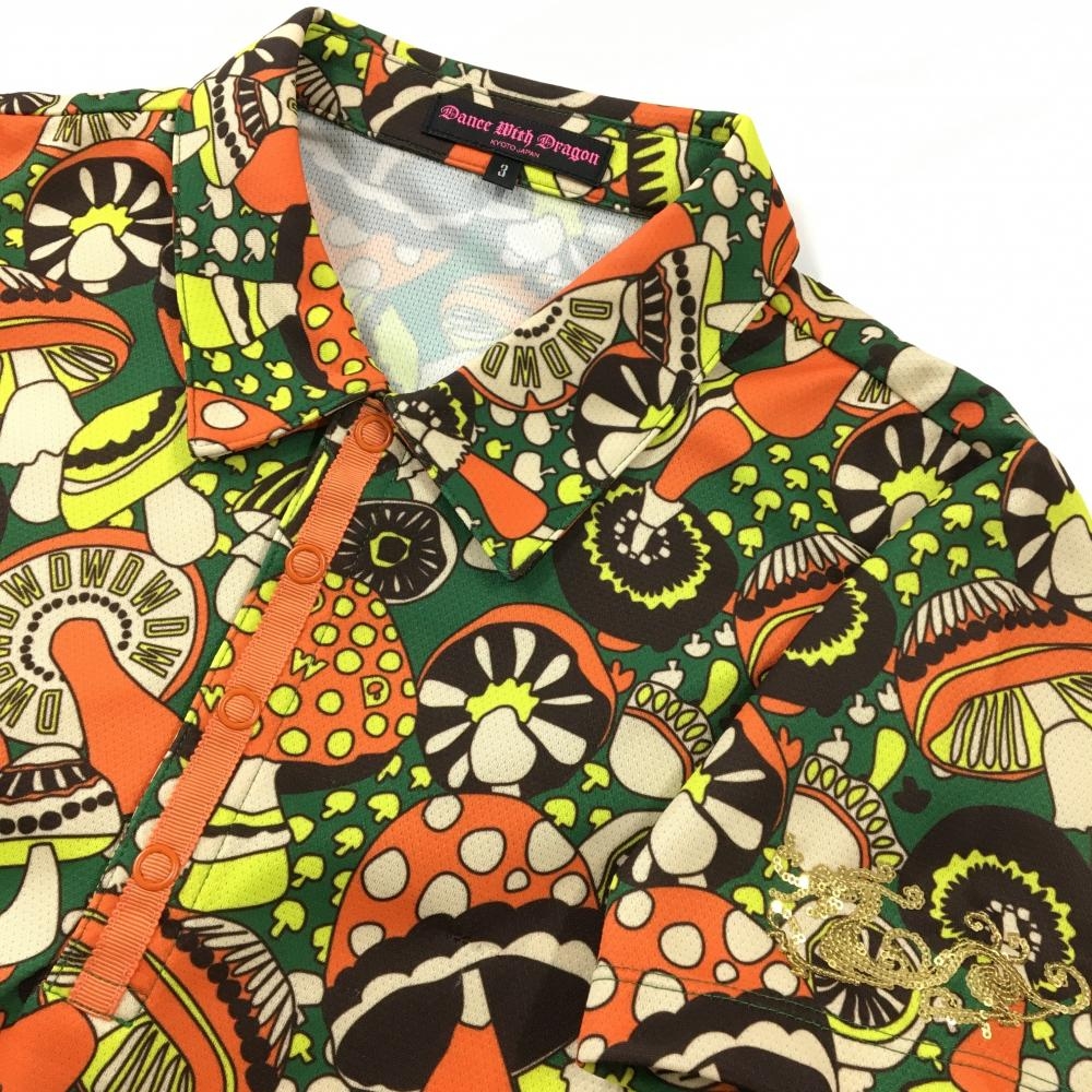 【超美品】ダンスウィズドラゴン 半袖ポロシャツ グリーン×オレンジ キノコ総柄 レディース 3(L) ゴルフウェア Dance With Dragon