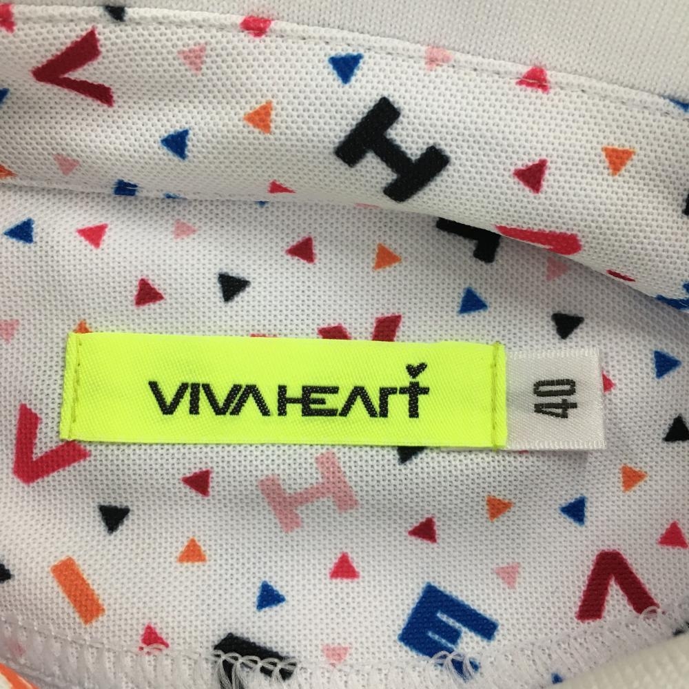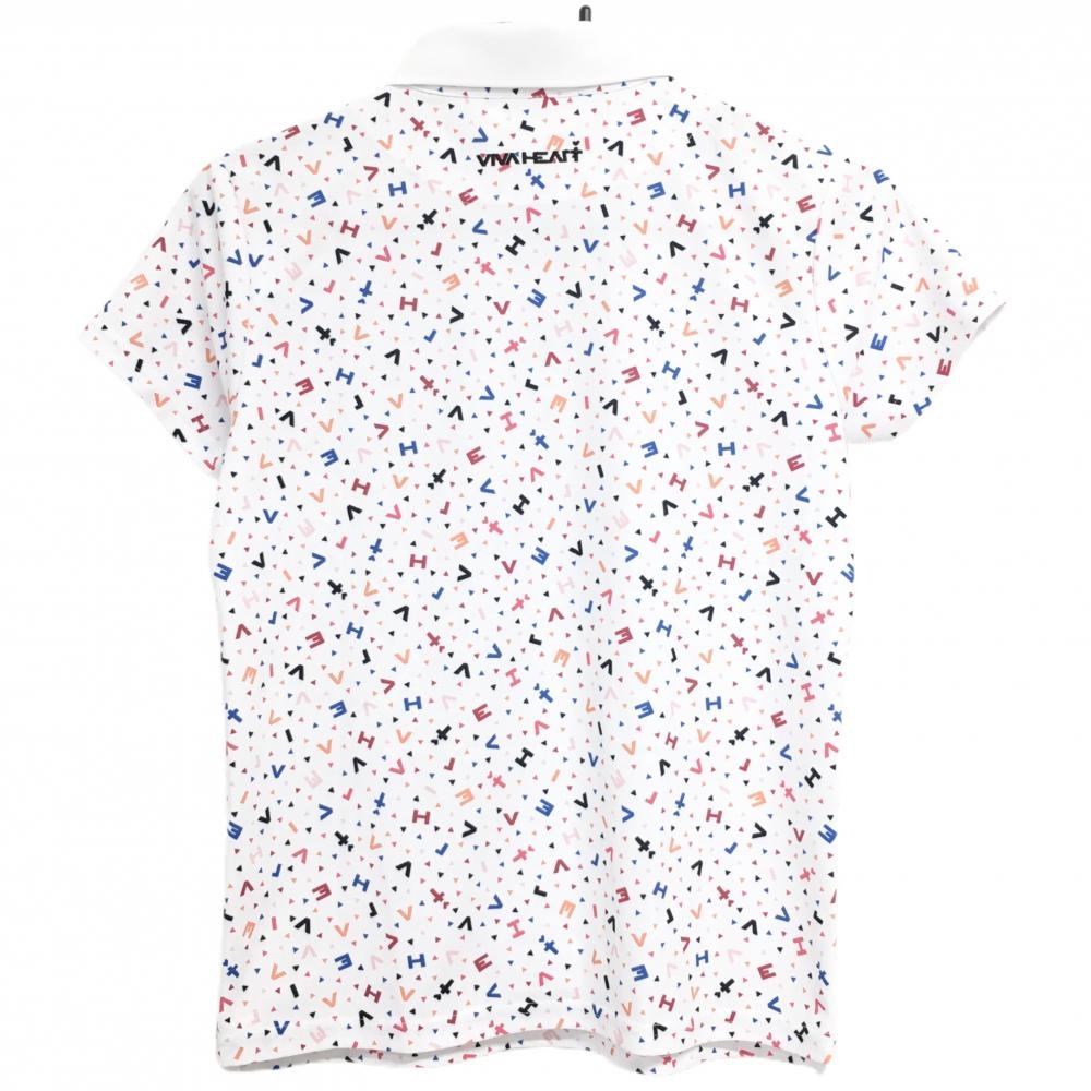 【超美品】ビバハート 半袖ポロシャツ 白×マルチカラー 総柄 襟ロゴ刺しゅう レディース 40(M) ゴルフウェア VIVA HEART