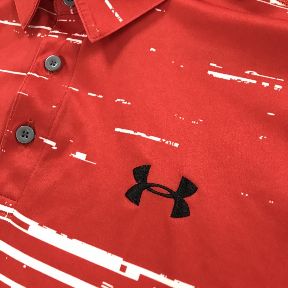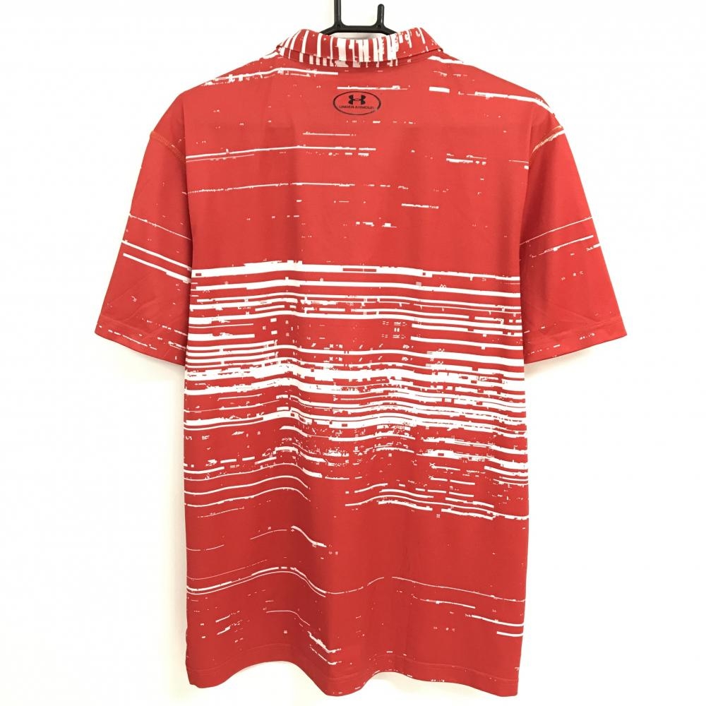 【美品】アンダーアーマー 半袖ポロシャツ レッド×白 総柄 ロゴ刺しゅ メンズ 2XL ゴルフウェア 大きいサイズ UNDER ARMOUR