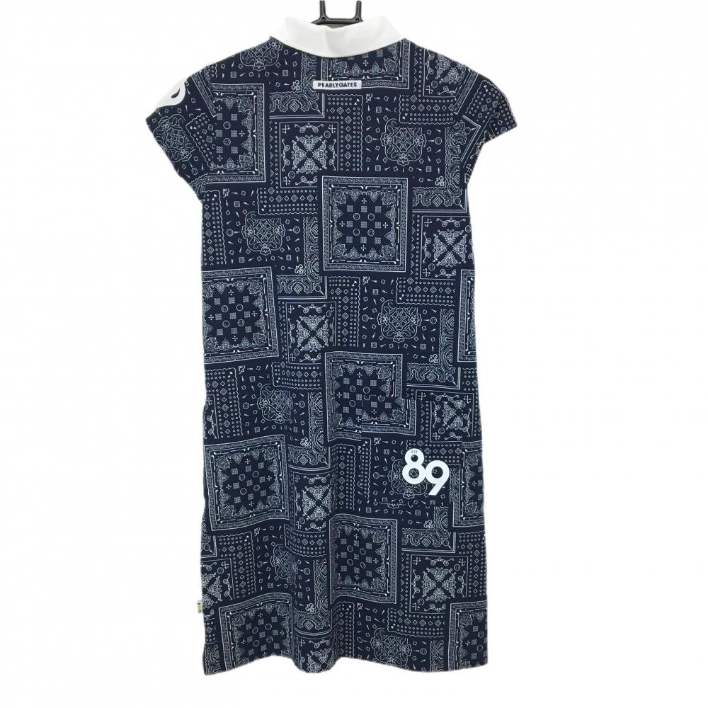 【美品】パーリーゲイツ 半袖ポロワンピース ネイビー×白 総柄 内側ニコちゃん レディース 0(S) ゴルフウェア PEARLY GATES