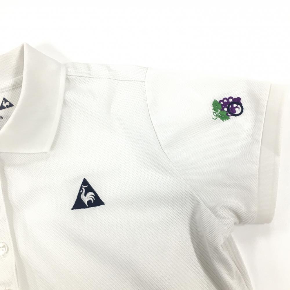 ルコックゴルフ 半袖ポロシャツ 白×マルチカラー 前面フルーツ総柄刺しゅう 英字 レディース L ゴルフウェア le coq sportif