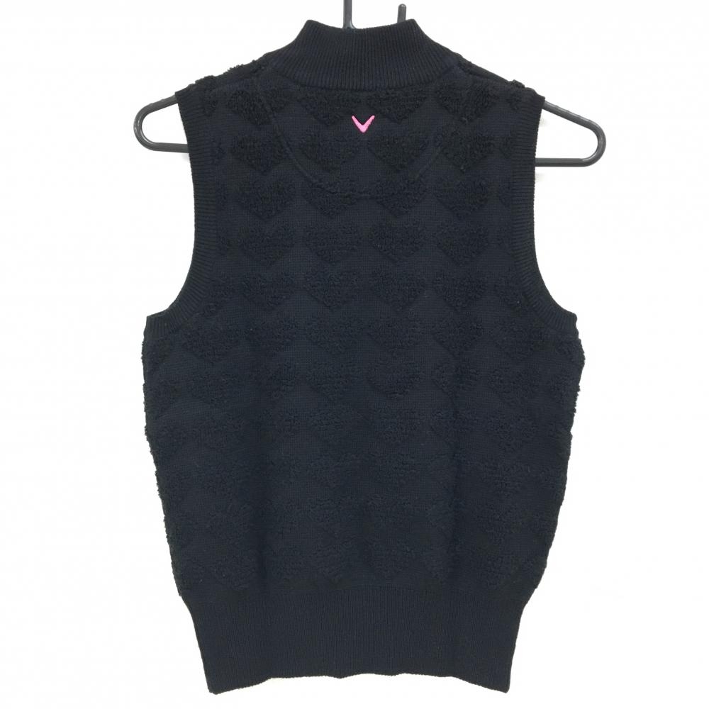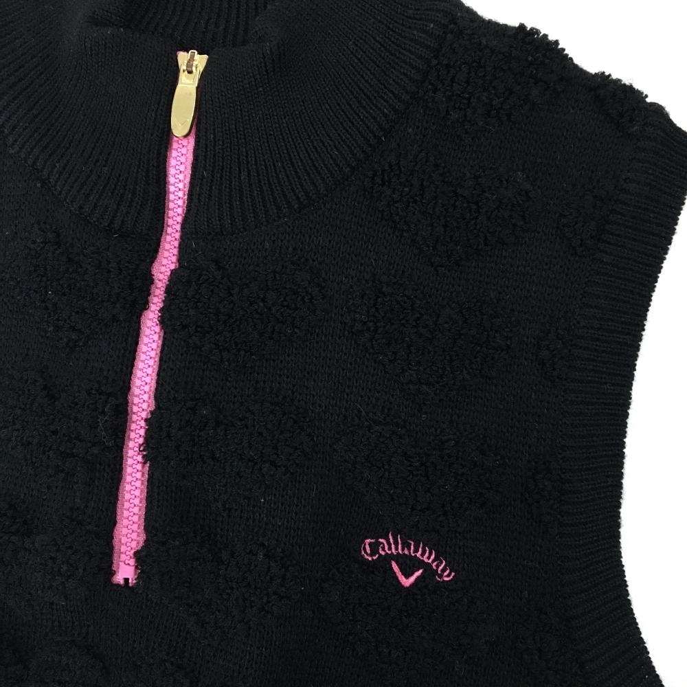 【美品】キャロウェイ ハイネックニットベスト 黒×ピンク 立体ハート編み ハーフジップ ウール混 レディース L ゴルフウェア Callaway