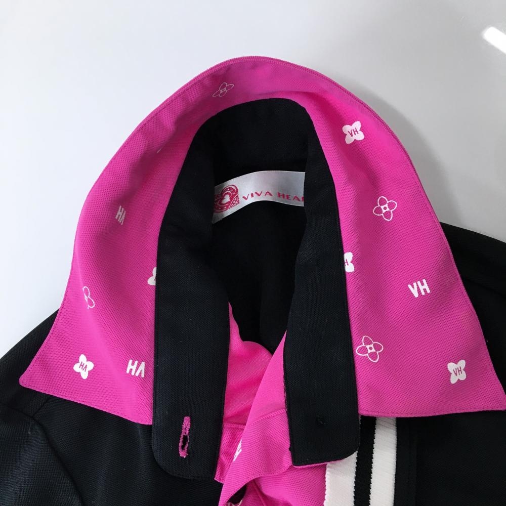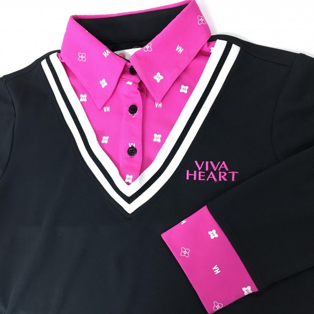 【美品】ビバハート 長袖ポロシャツ 黒×ピンク 重ね着風 襟・袖口ロゴ総柄 レディース 40(M) ゴルフウェア VIVA HEART