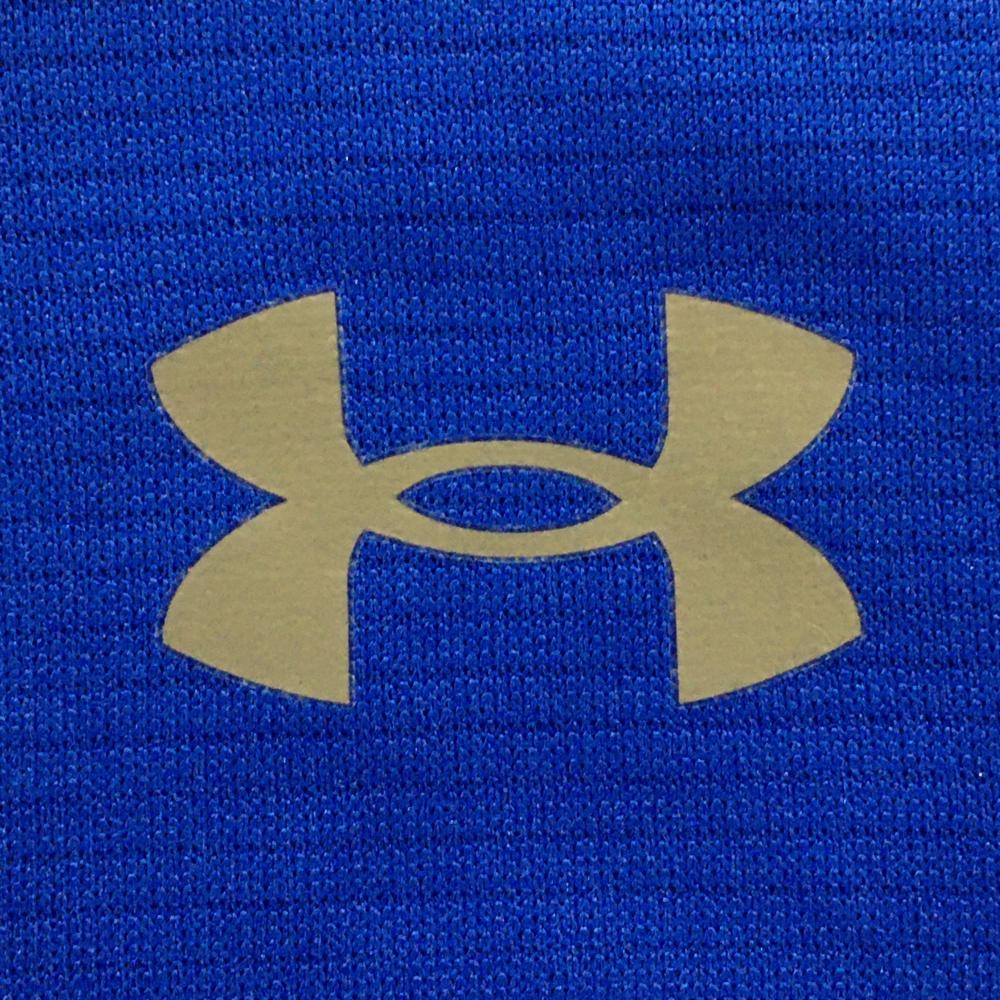 【超美品】アンダーアーマー 半袖ポロシャツ ブルー×グレー ボーダー織生地 胸元ロゴ メンズ SM/P/CH ゴルフウェア UNDER ARMOUR