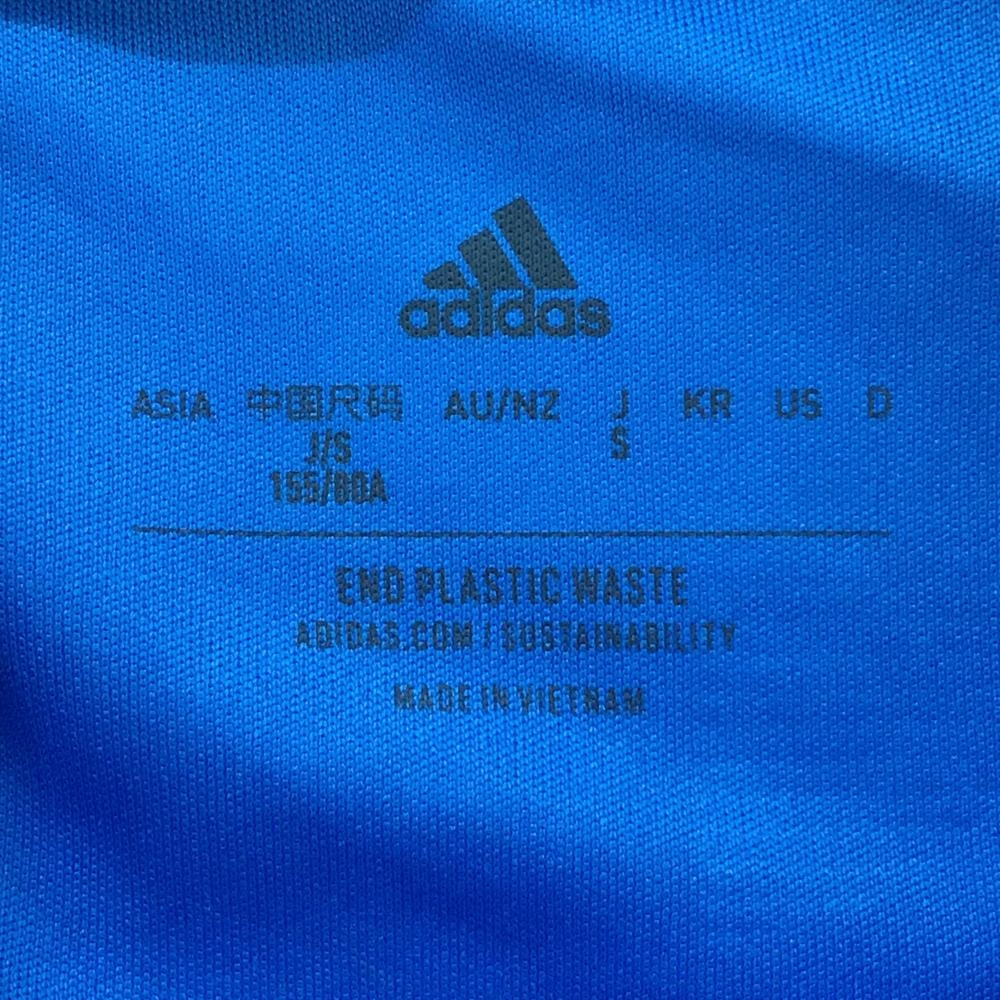 【美品】アディダス 半袖ハイネックシャツ ブルー 地模様 袖3ライン レディース S ゴルフウェア adidas