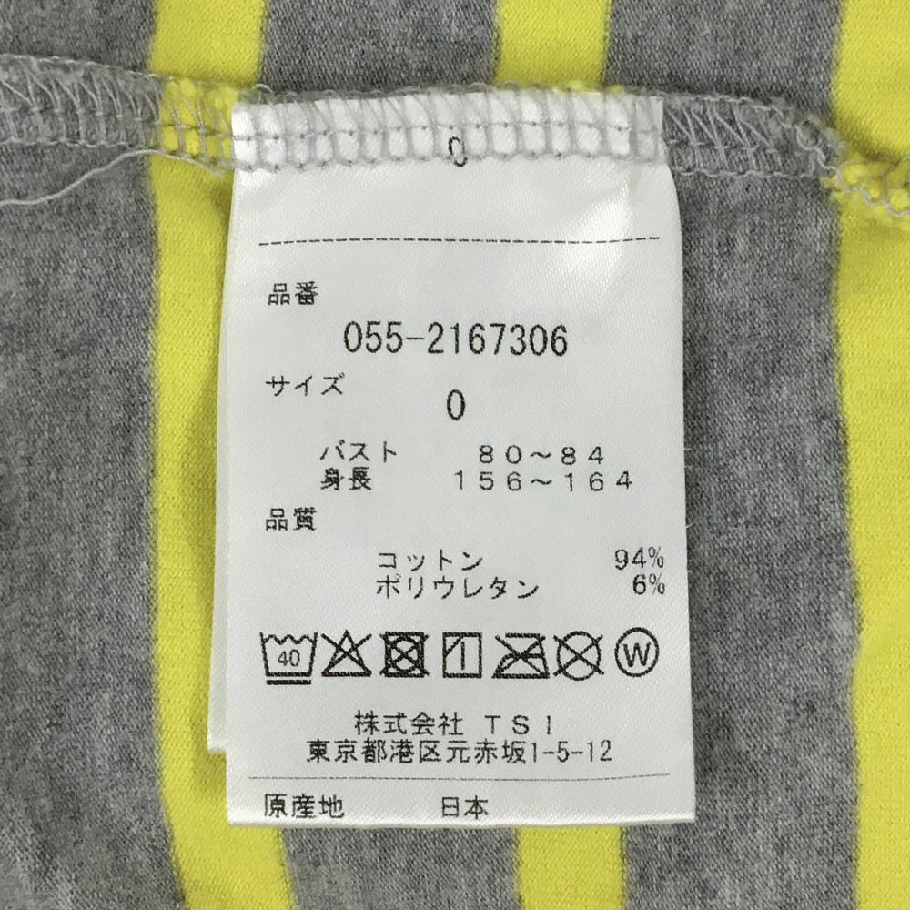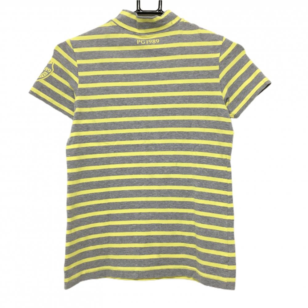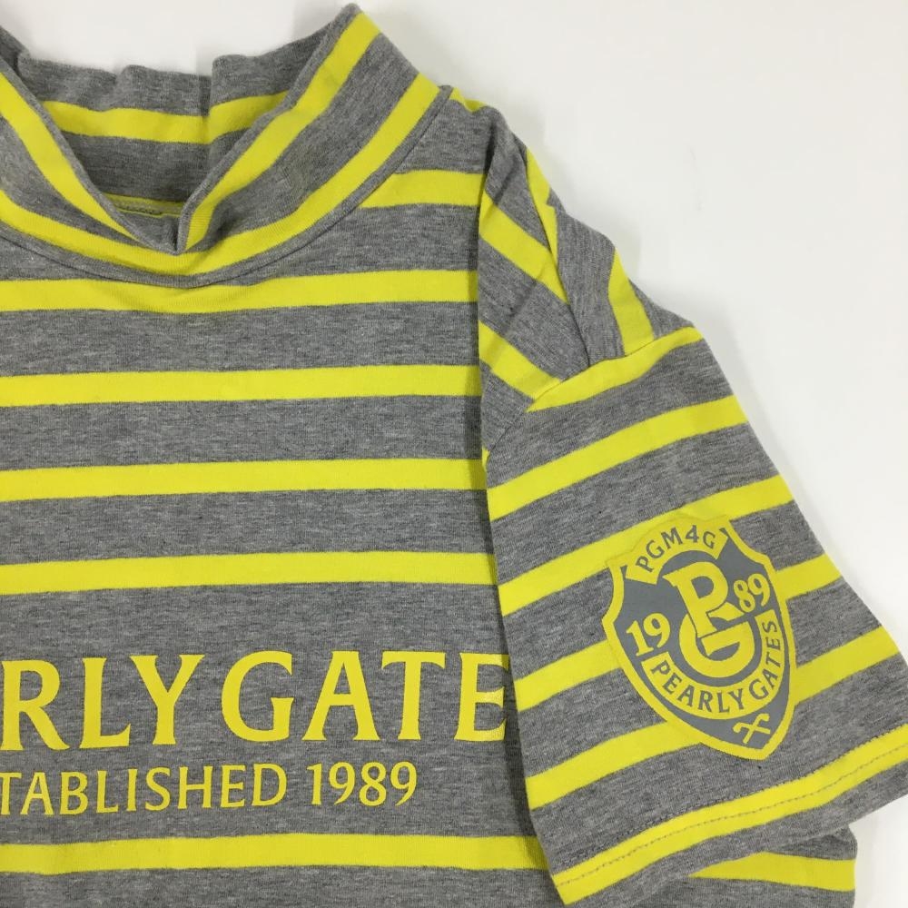 【美品】パーリーゲイツ 半袖ハイネックシャツ グレー×イエロー ボーダー ロゴプリント レディース 0(S) ゴルフウェア PEARLY GATES