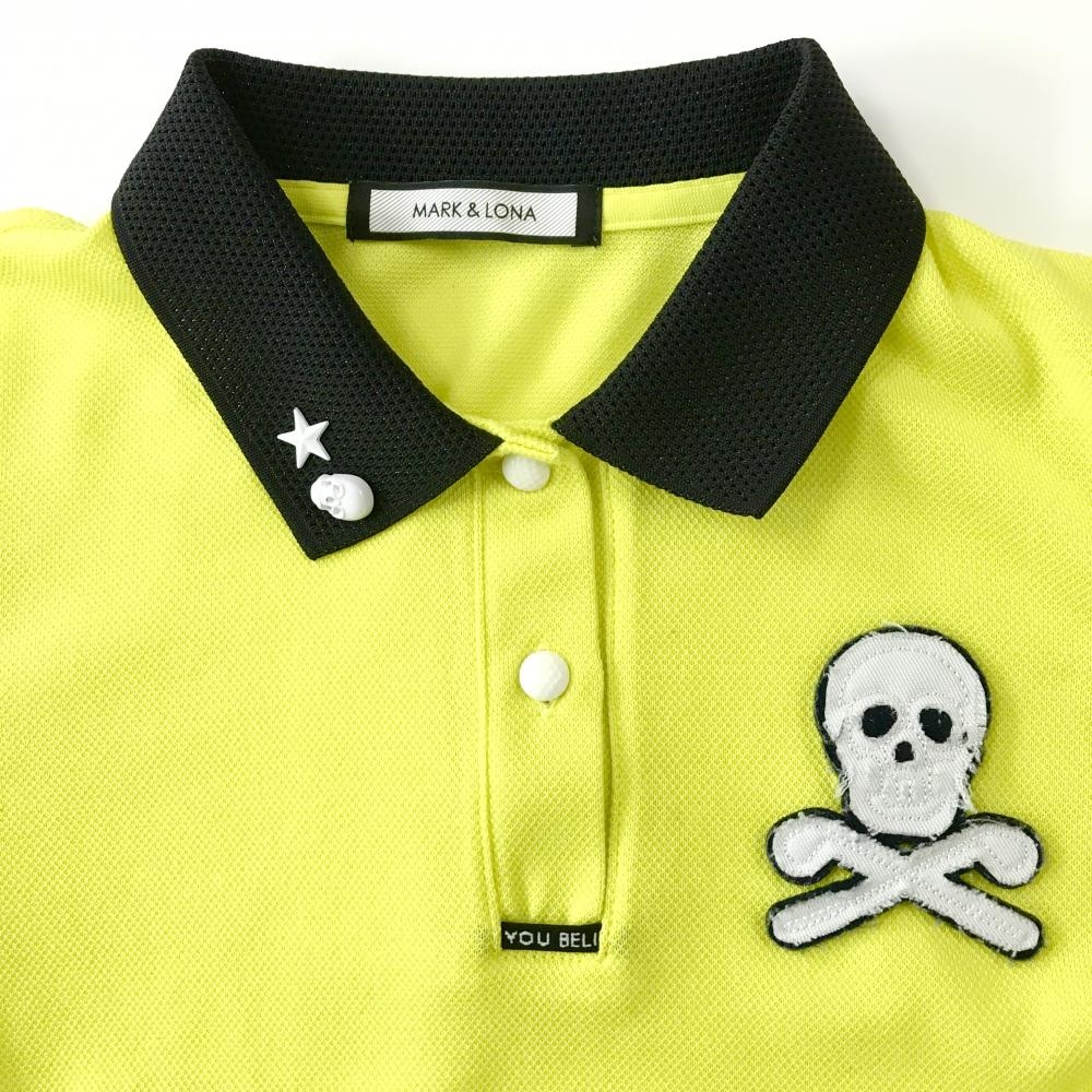 【美品】マークアンドロナ 半袖ポロシャツ イエロー×黒 襟・袖口メッシュ&ラメ ダメージ加工 レディース 36(S) ゴルフウェア MARK&LONA