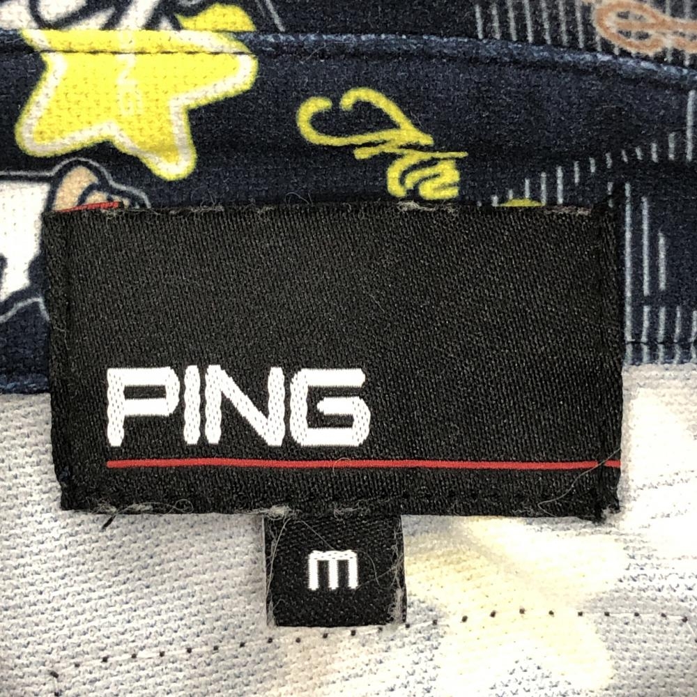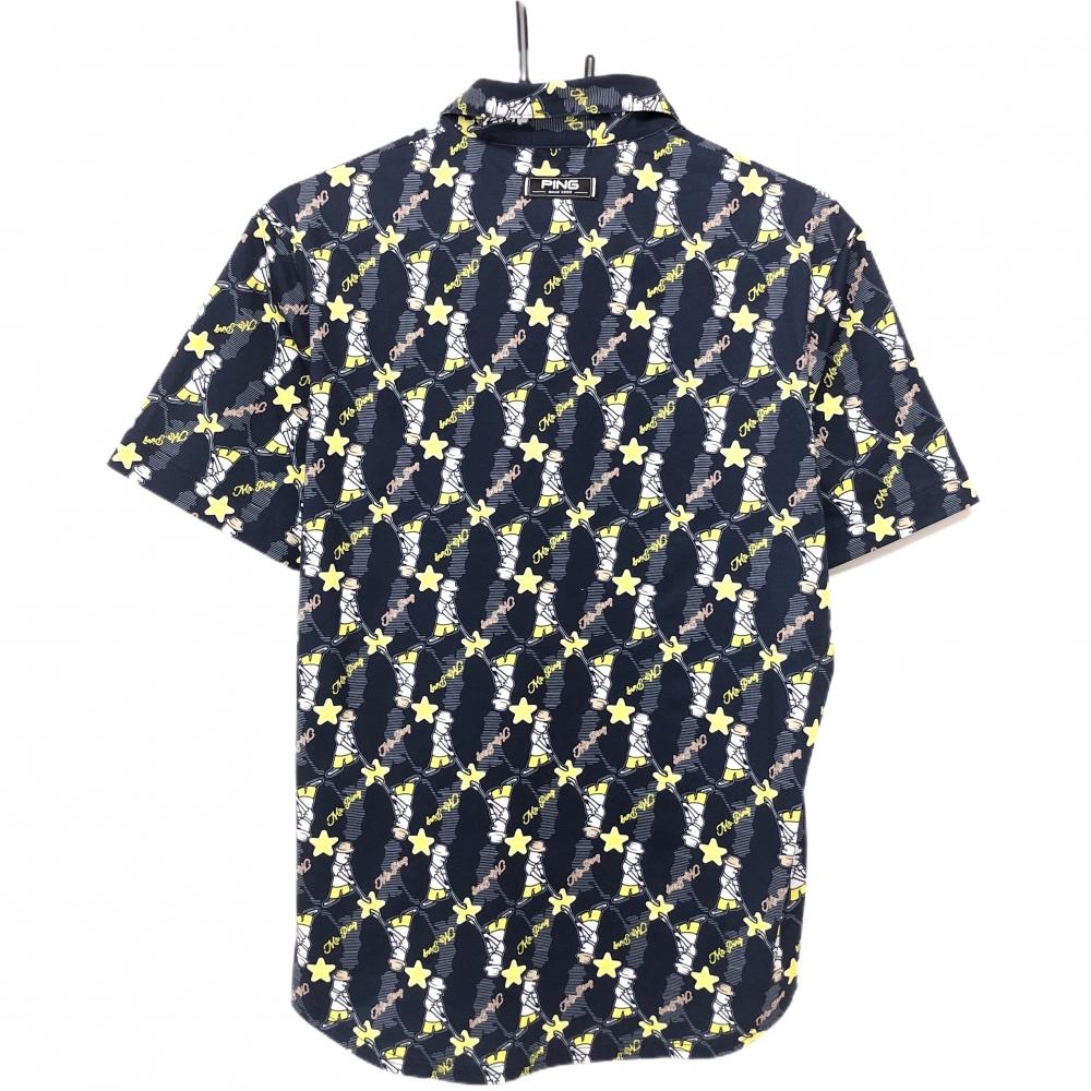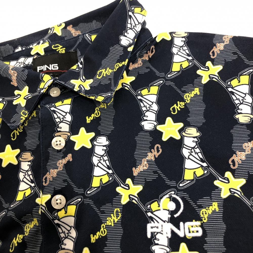 【美品】ピン 半袖ポロシャツ ネイビー×イエロー Mr.PING・星総柄 ロゴ刺しゅう メンズ M ゴルフウェア 2024年モデル PING