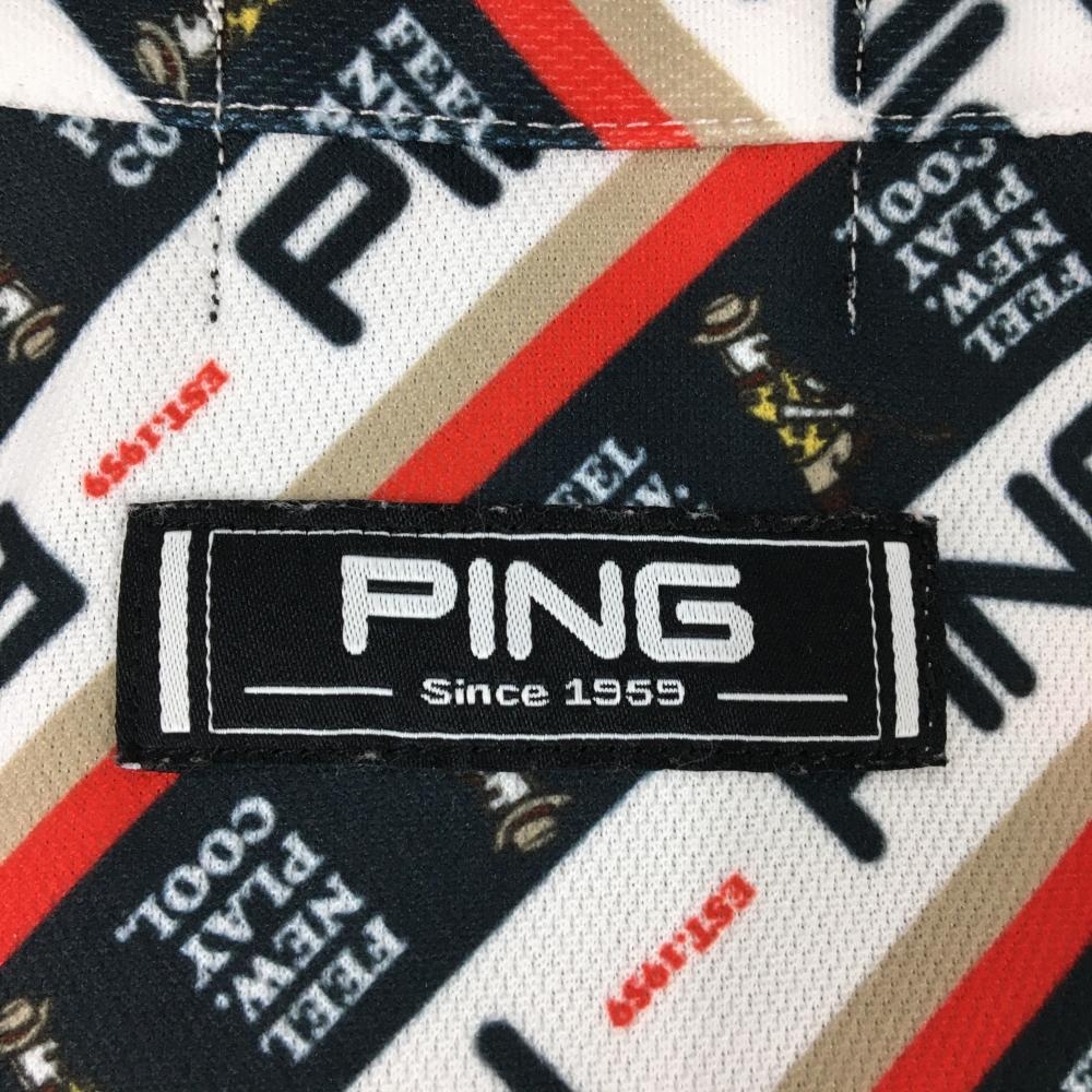 【超美品】ピン 半袖ポロシャツ 白×ネイビー×レッド 斜めロゴストライプ ロゴ刺しゅう メンズ M ゴルフウェア PING
