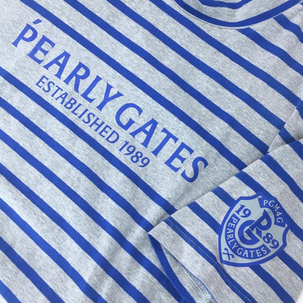【美品】パーリーゲイツ 半袖ハイネックシャツ グレー×ブルー ボーダー ストレッチ メンズ 5(L) ゴルフウェア PEARLY GATES