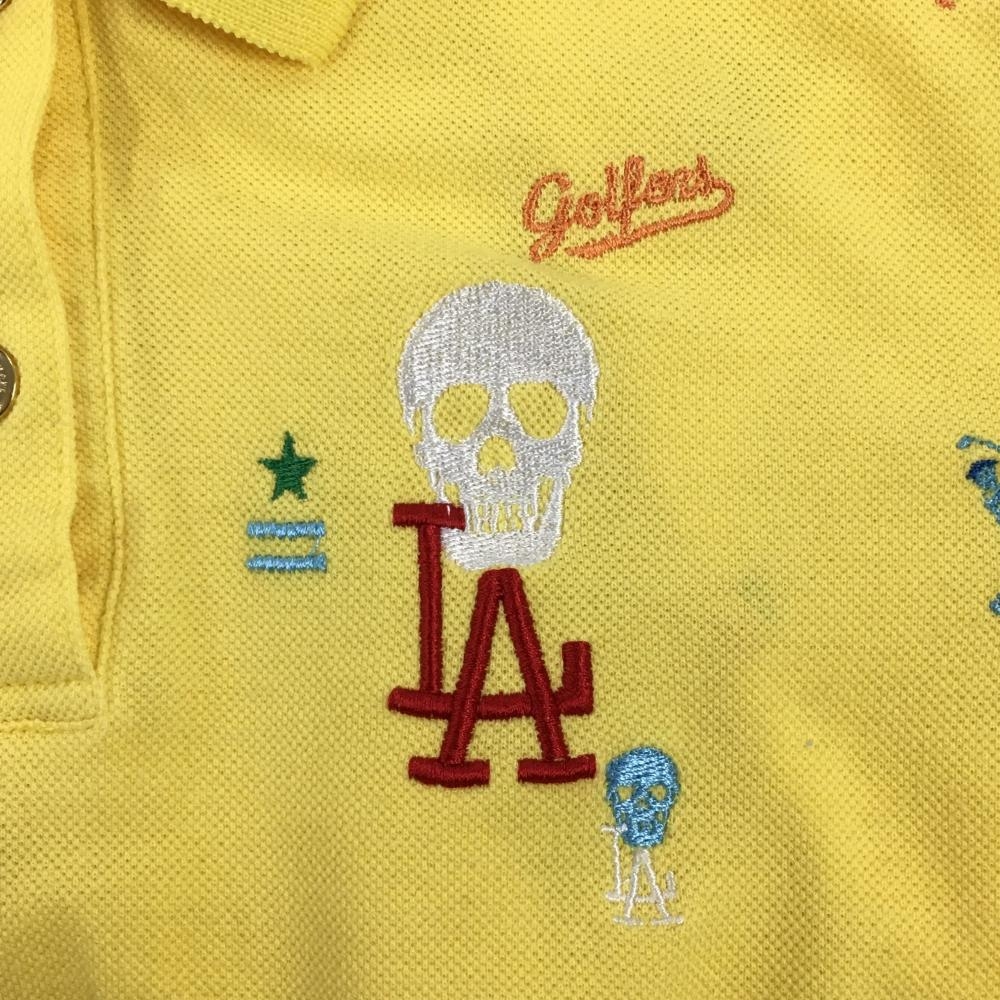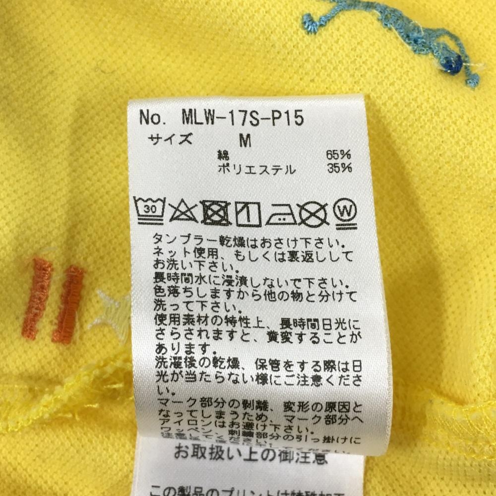 【美品】マークアンドロナ 半袖ポロシャツ イエロー×ライトブルー 刺しゅう総柄 襟裏プリント レディース M ゴルフウェア MARK&LONA