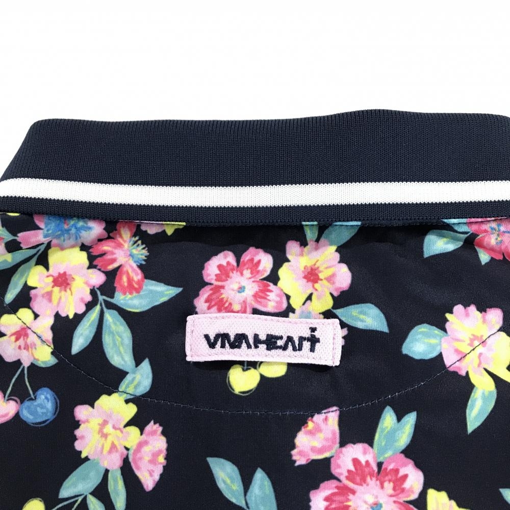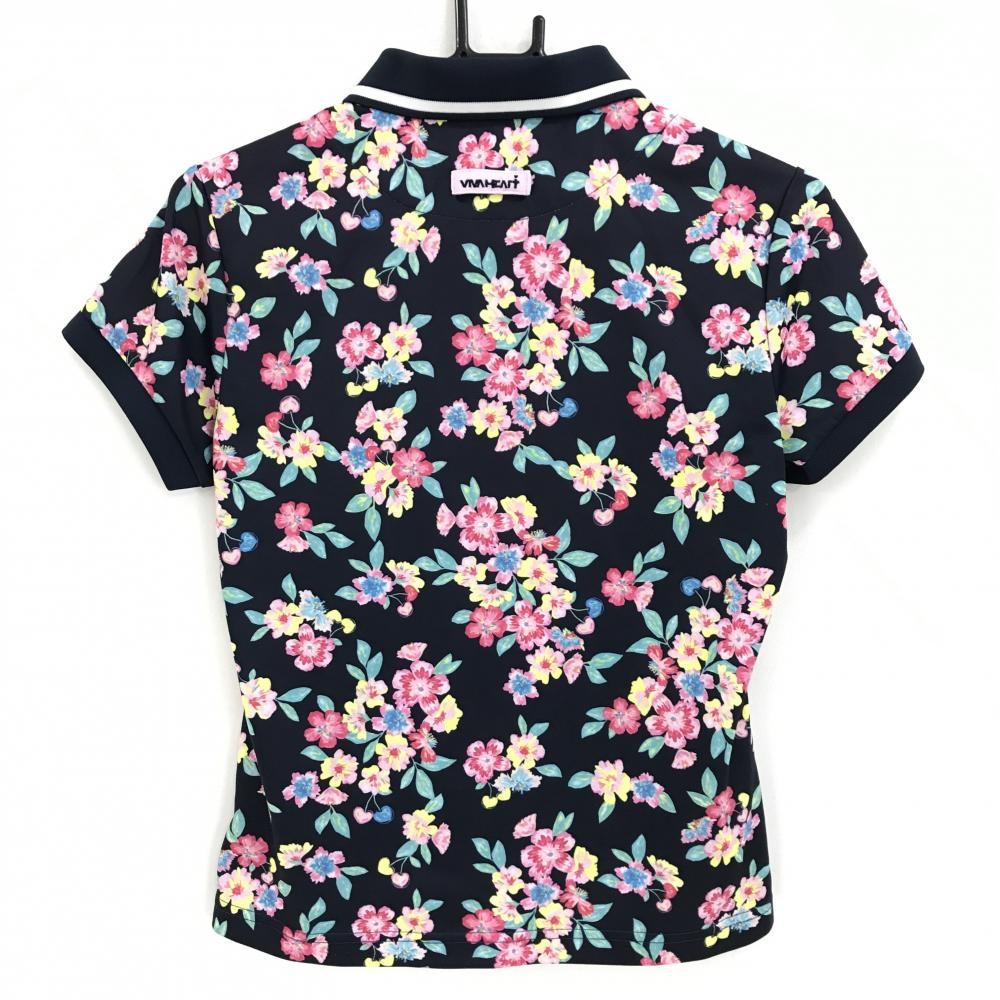 【美品】ビバハート 半袖ポロシャツ ネイビー×ピンク×グリーン系 花柄 レディース 42(L) ゴルフウェア VIVA HEART