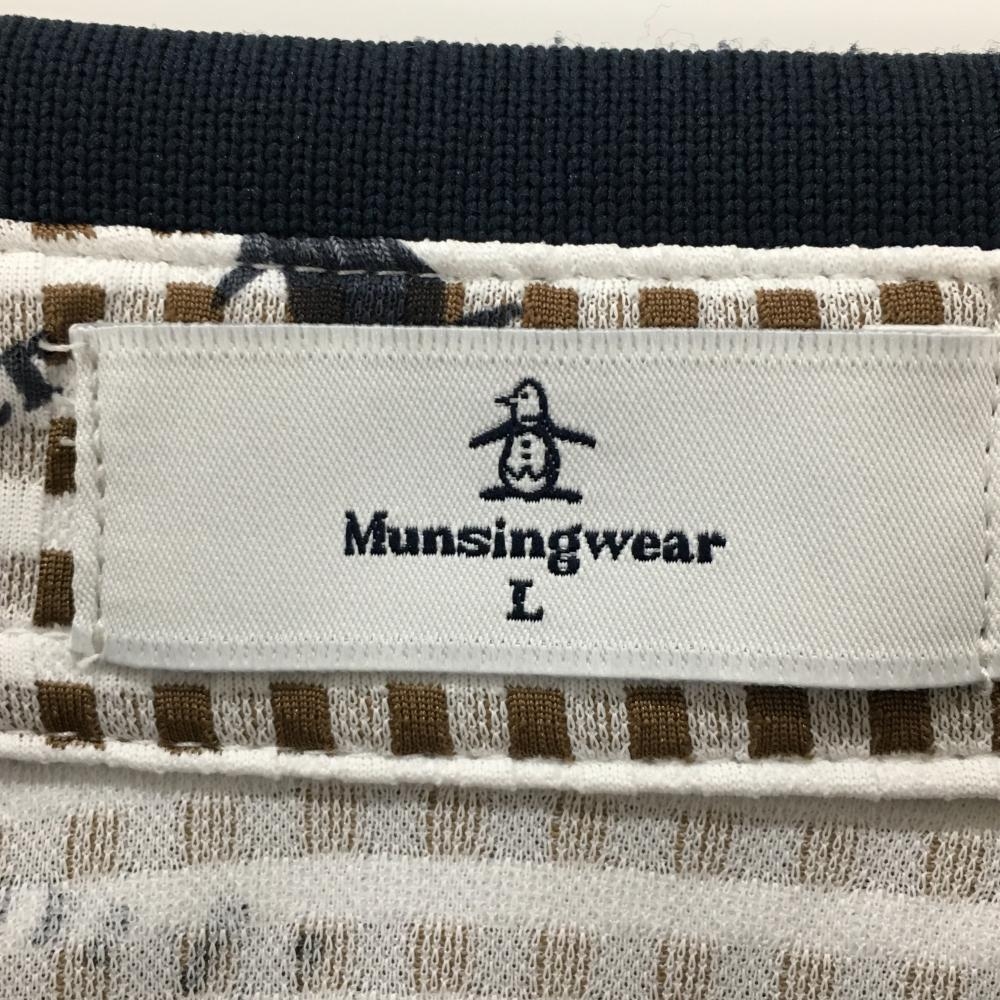【超美品】マンシングウェア 半袖ポロシャツ 白×ネイビー チェック織生地 ロゴ総柄 レディース L ゴルフウェア Munsingwear