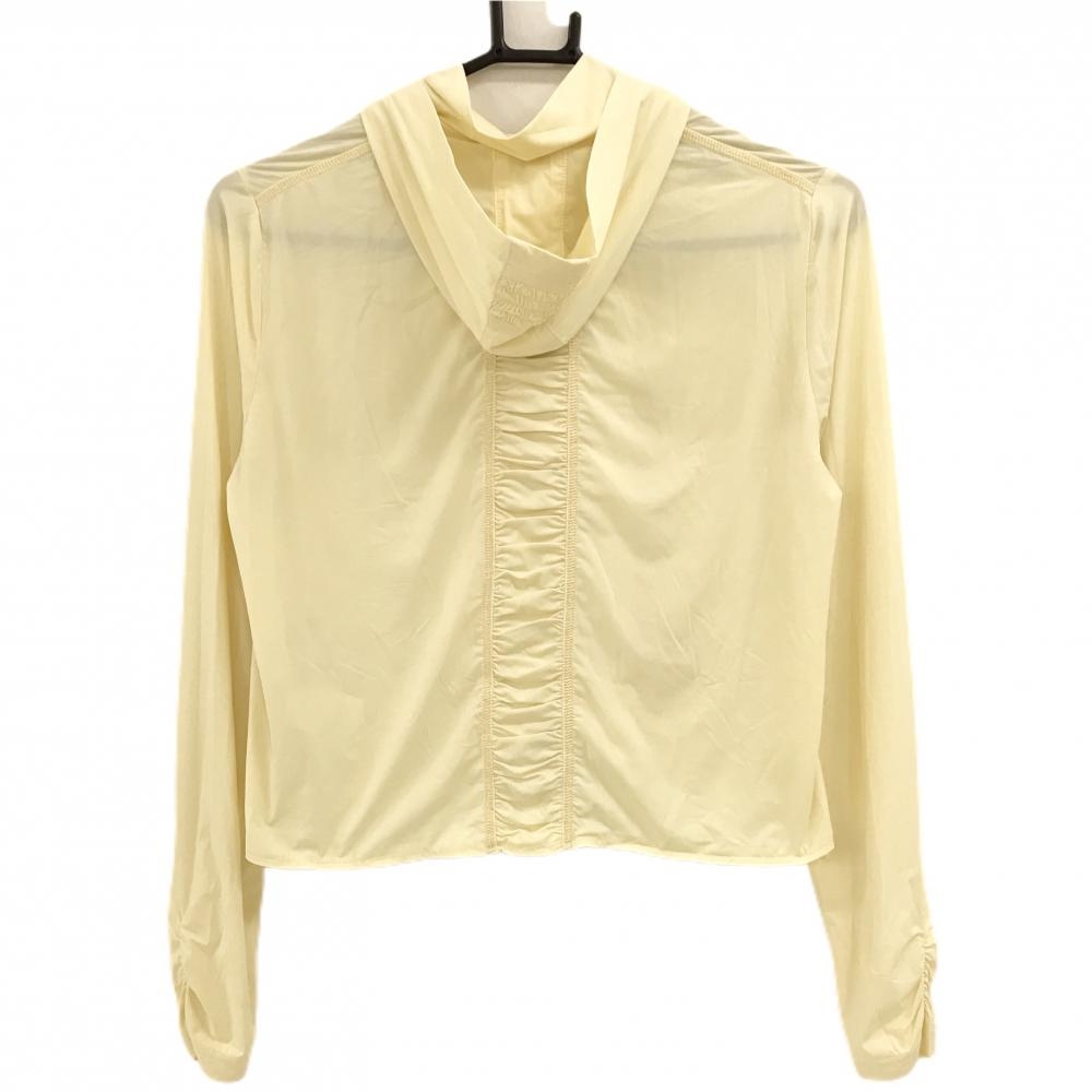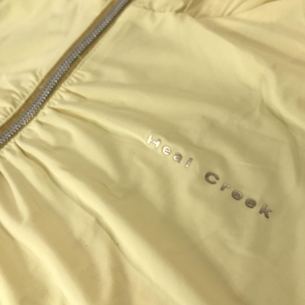 【超美品】ヒールクリーク ナイロンジャケット ライトイエロー 胸元ロゴ フード付き 薄手 レディース 40(M) ゴルフウェア Heal Creek