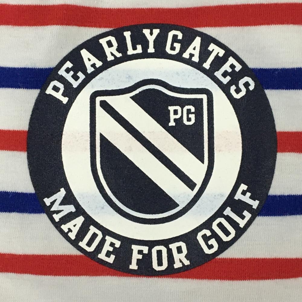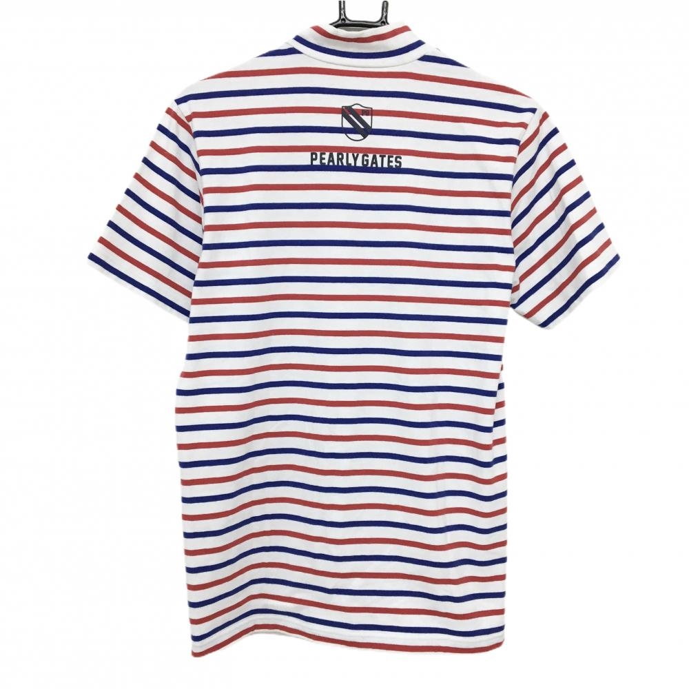 【美品】パーリーゲイツ 半袖ハイネックシャツ 白×レッド×ブルー ボーダー ネックロゴ メンズ 5(L) ゴルフウェア PEARLY GATES