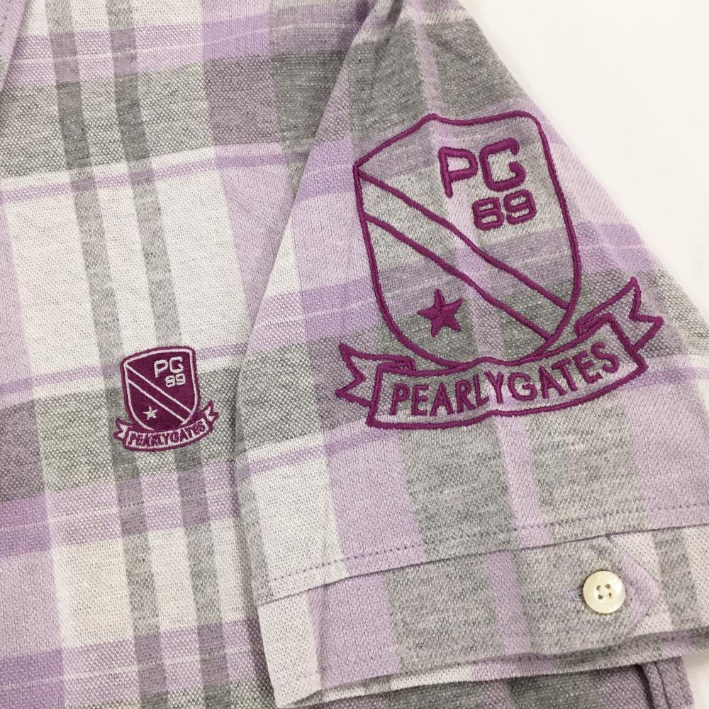 【超美品】パーリーゲイツ 半袖ポロシャツ グレー×ライトパープル チェック ロゴ メンズ 4(M) ゴルフウェア PEARLY GATES