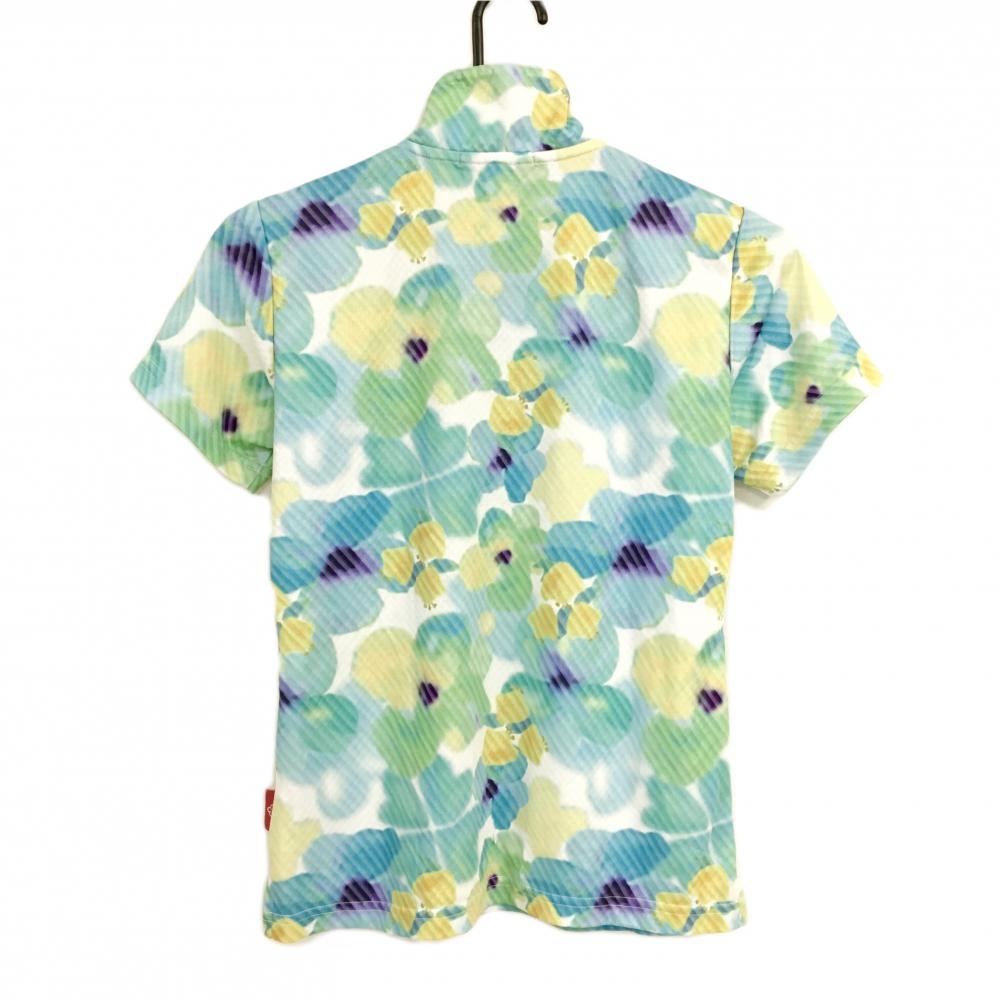 【超美品】マリクレールスポール 半袖ハイネックシャツ 白×グリーン 花柄 ハーフジップ レディース M ゴルフウェア marie claire